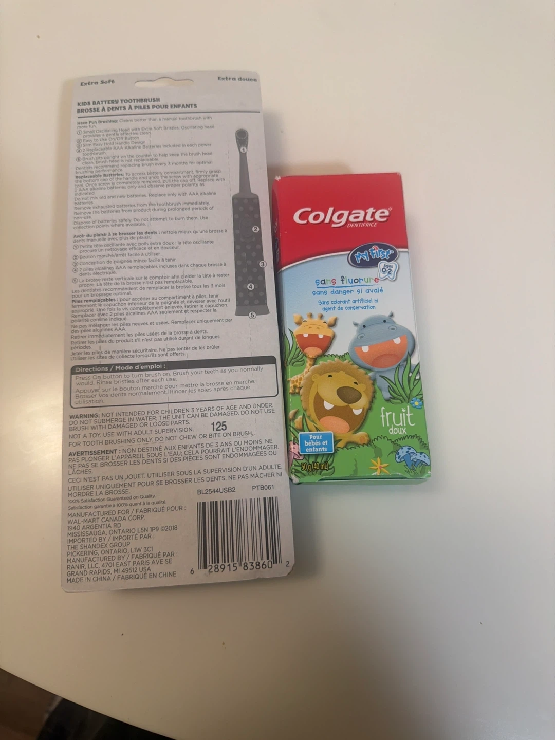 This is a set featuring an Extra Soft battery-powered toothbrush and a tube of Colgate's My First toothpaste. The toothbrush is designed with an easy hold and comes in a pack with two brushes. The toothpaste is fluoride-free, sugar-free, and has no artificial sweeteners or preservatives, in a fun mid-fruit flavour. It's suitable for infants and toddlers.