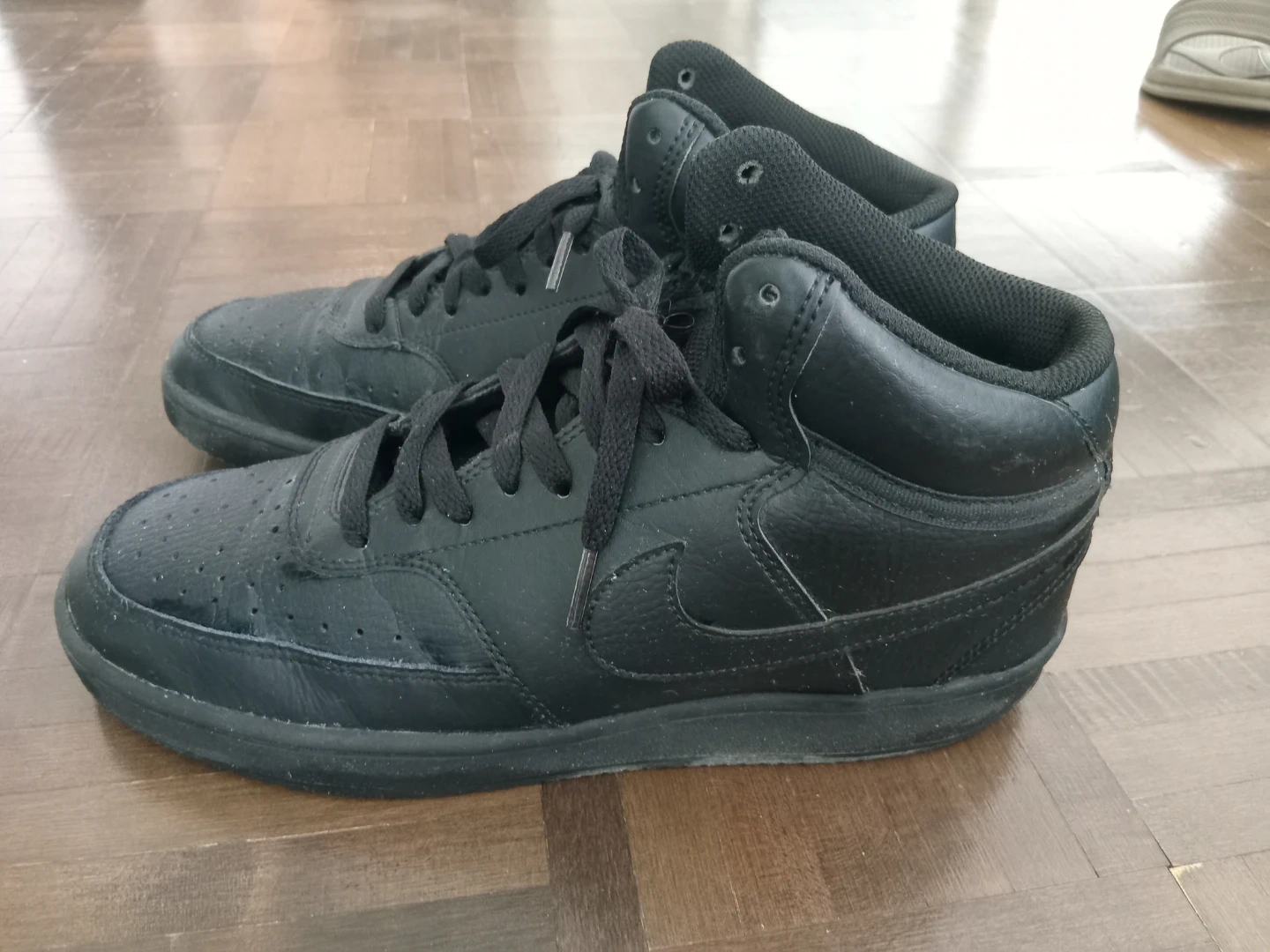 Black Nike Court Vision Mid sneakers for women. Size US 8.5 (EU 42). These high-tops are made of leather and synthetic materials. Laces closure. Great for casual wear!