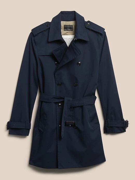This Navy Banana Republic trench coat is a stylish outerwear piece. It's a size Large. It features a double-breasted closure and a tie belt. This coat is great for transitional weather.