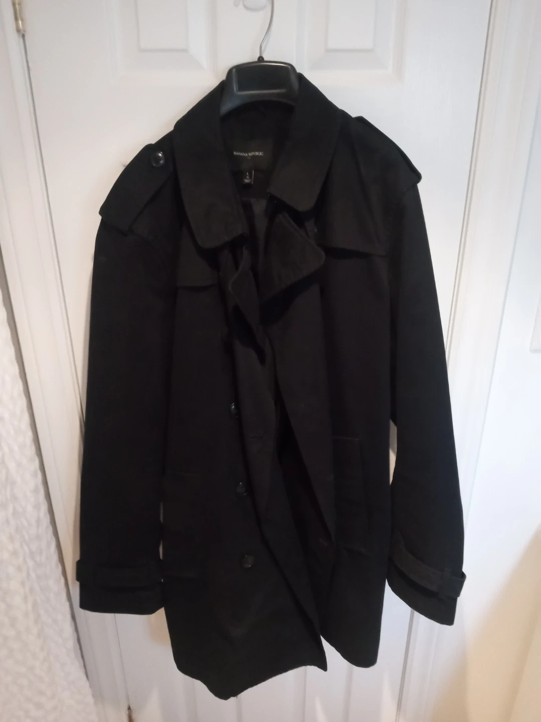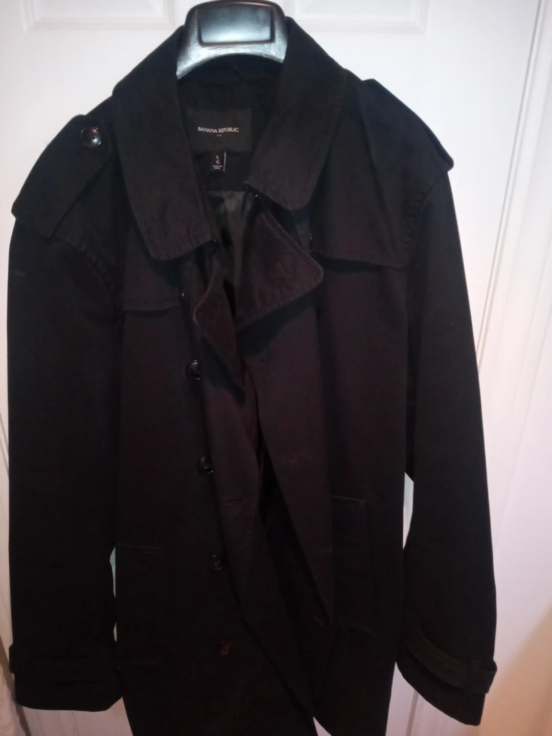 This Navy Banana Republic trench coat is a stylish outerwear piece. It's a size Large. It features a double-breasted closure and a tie belt. This coat is great for transitional weather.