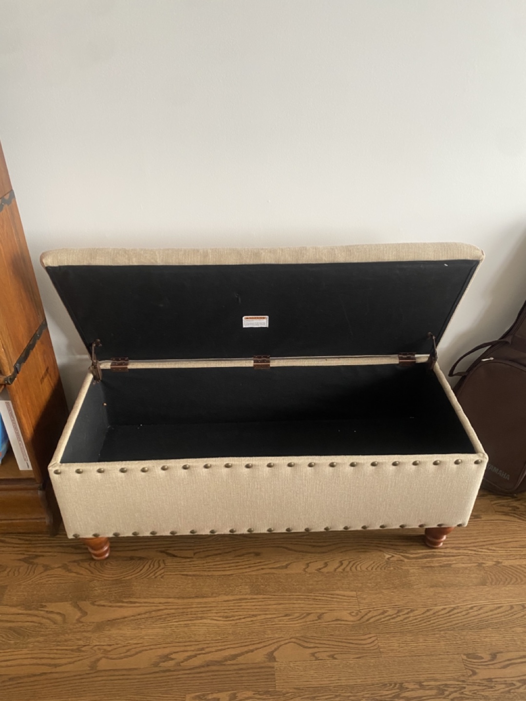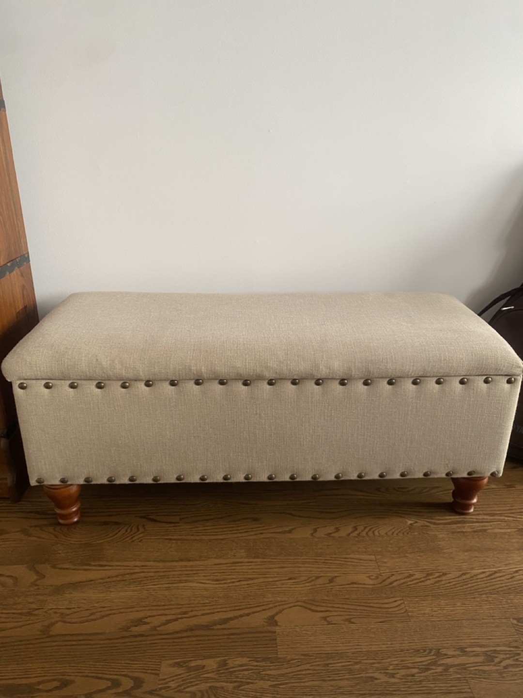Beige fabric storage ottoman. Features wooden legs and nailhead trim. Recently cleaned with a fabric steamer.