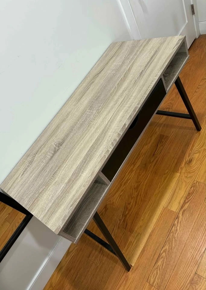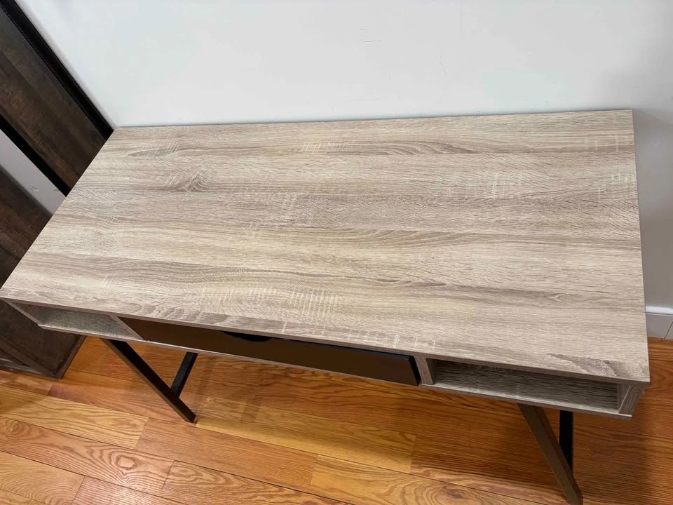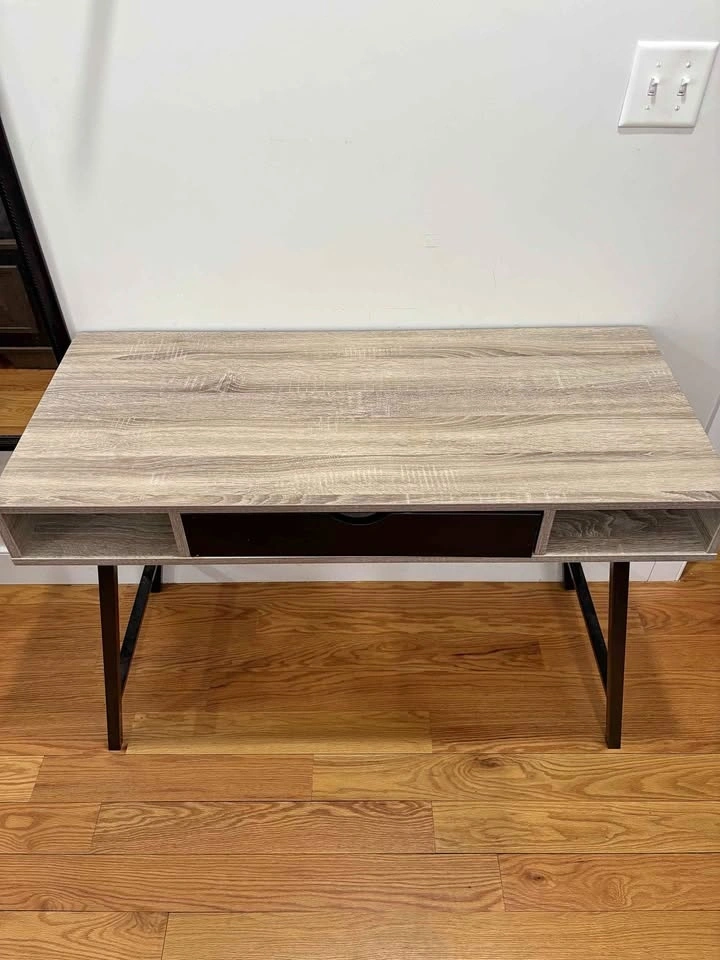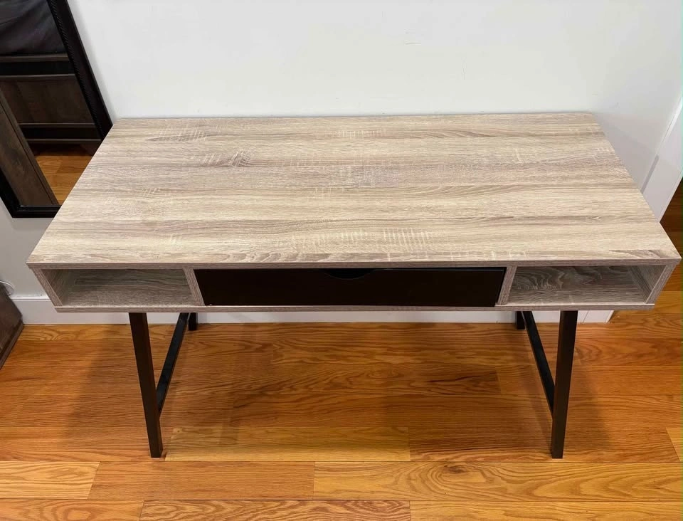 Modern desk or console table in excellent condition. Clean wood finish with black metal legs and a center drawer for storage. Great for a laptop desk, entryway table, or small workspace. Compact design works well in apartments or smaller spaces. Features: Center drawer for storage, Two open side compartments, Sturdy metal legs, Modern wood finish. Very clean and well maintained. Price: $120 OBO. Pickup only.