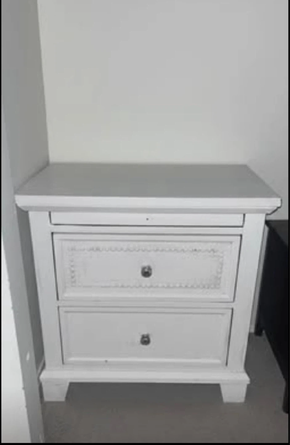 Simple white bedside table with two drawers and silver knobs, perfect for a bedroom or nursery. It has a rustic, hand painted look with some minor wear and character, but it’s sturdy and ready to use.