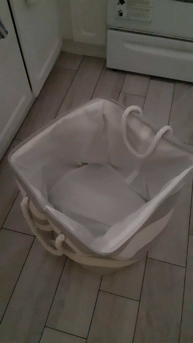 Here's a large handy storage bag with cute rope handles! It's perfect for organizing toys, laundry, blankets or anything else you need to tidy up. The striped design adds a nice touch to any room.