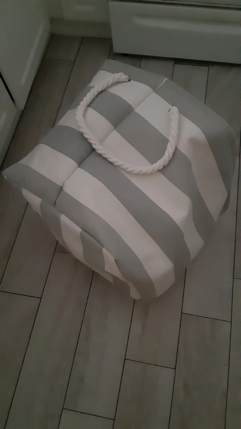 Here's a large handy storage bag with cute rope handles! It's perfect for organizing toys, laundry, blankets or anything else you need to tidy up. The striped design adds a nice touch to any room.