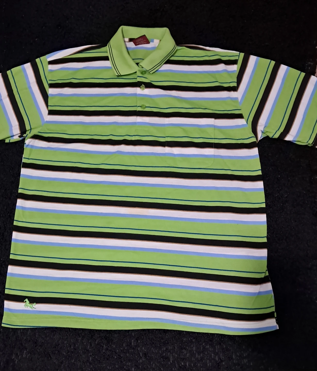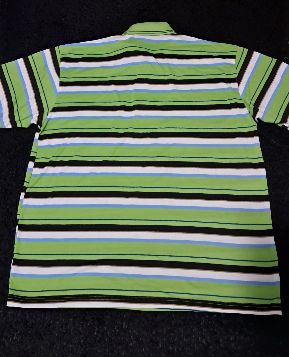 Striped polo shirt in green, black, and white. It's in good condition and ready for a new home!
