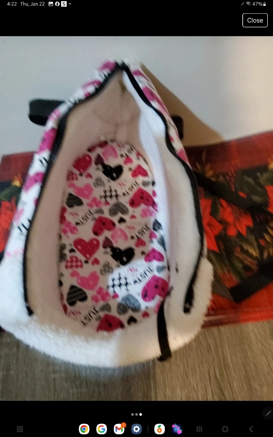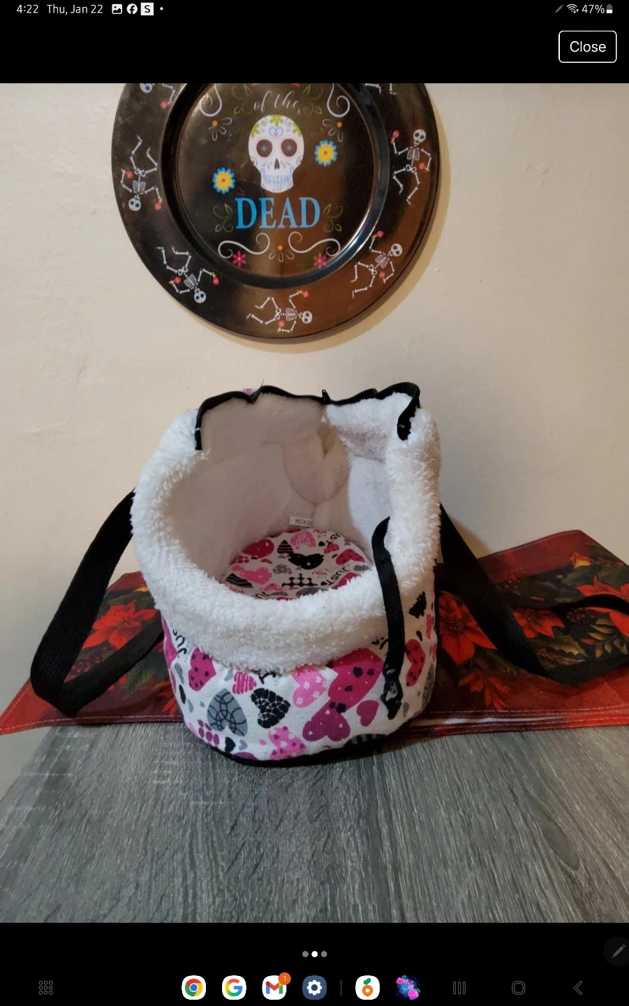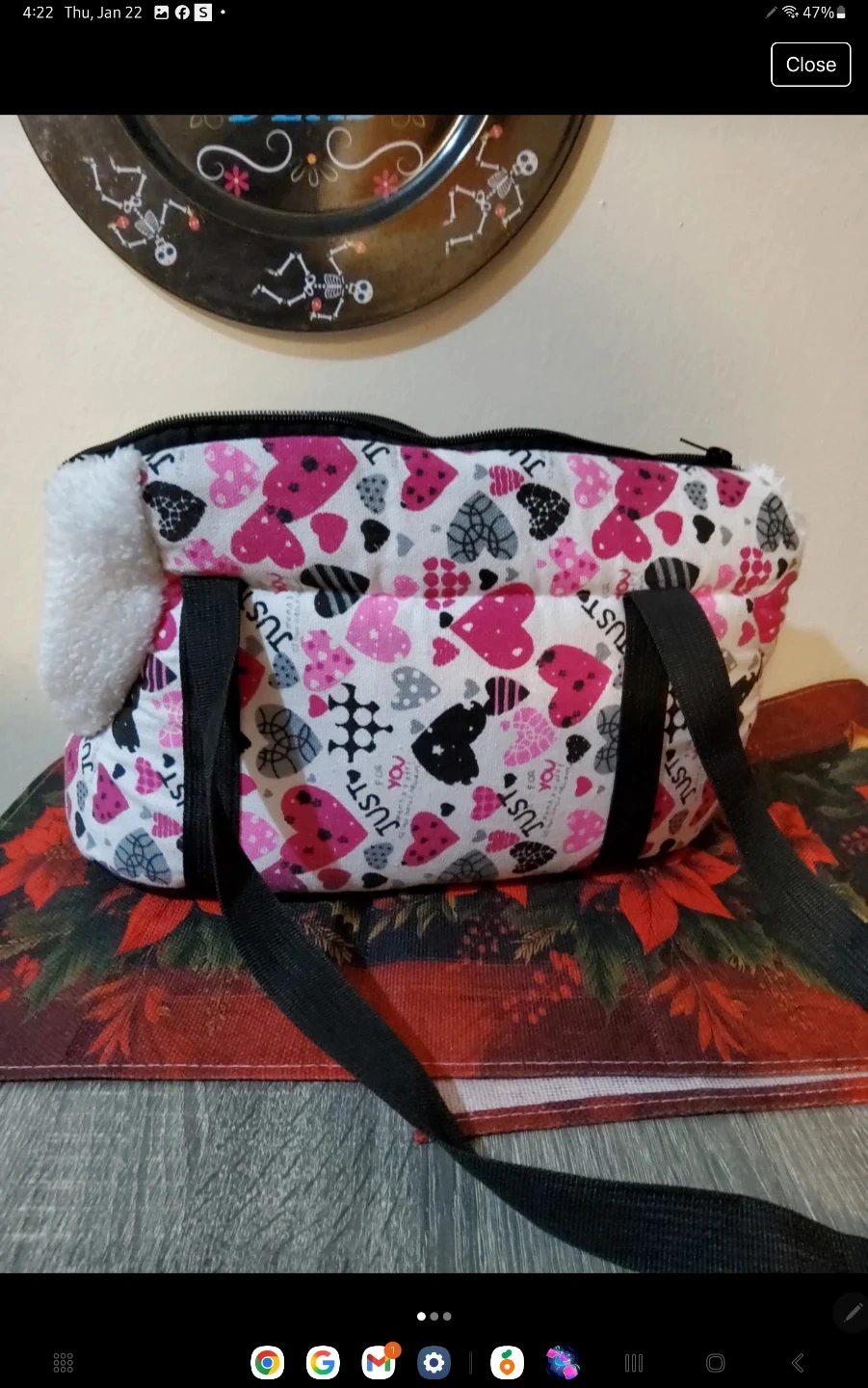 Selling a cute pet carrier bag adorned with a fun heart print. It features a soft, plush interior for your pet's comfort. Perfect for small animals on the go!