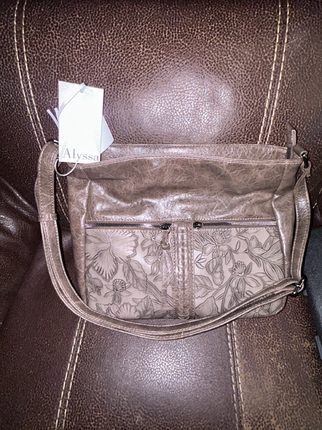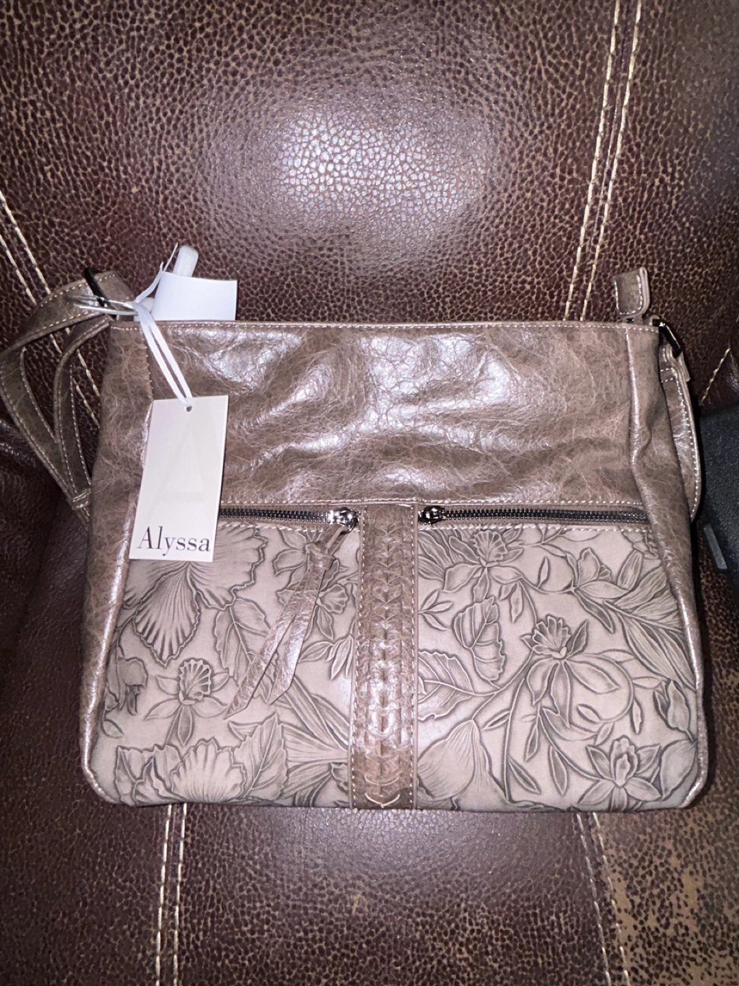 Here's a stylish Alyssa crossbody bag! It features a beautiful floral design on the front and is made of leather. Perfect for carrying your essentials in style