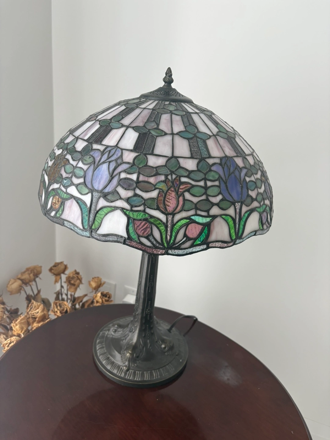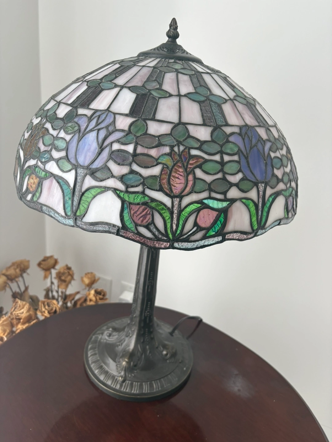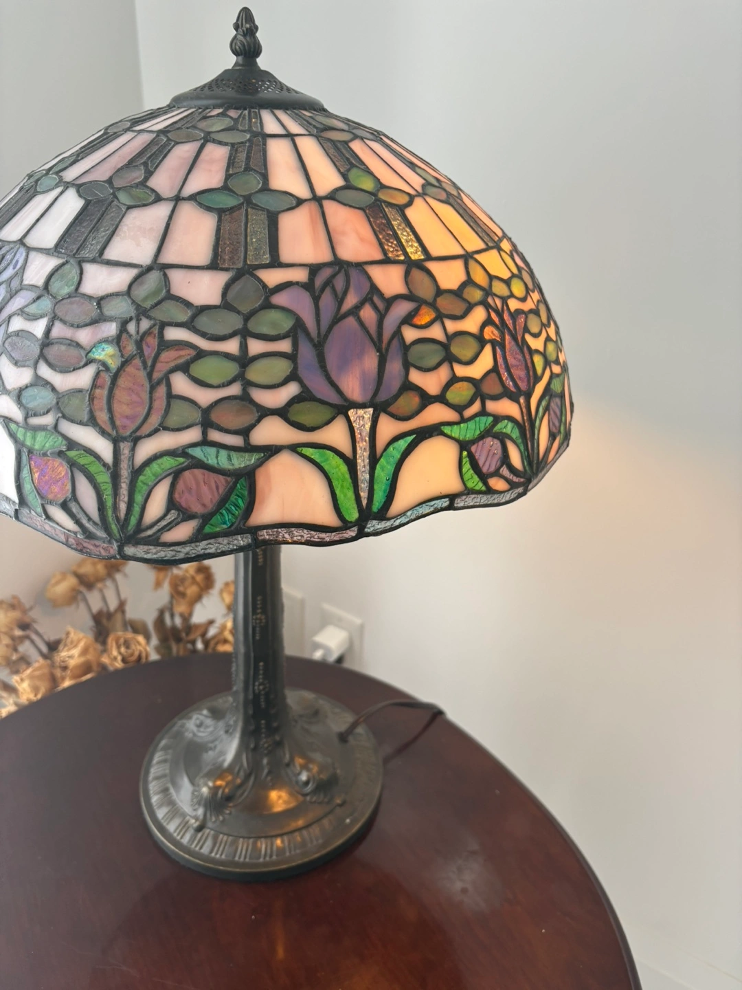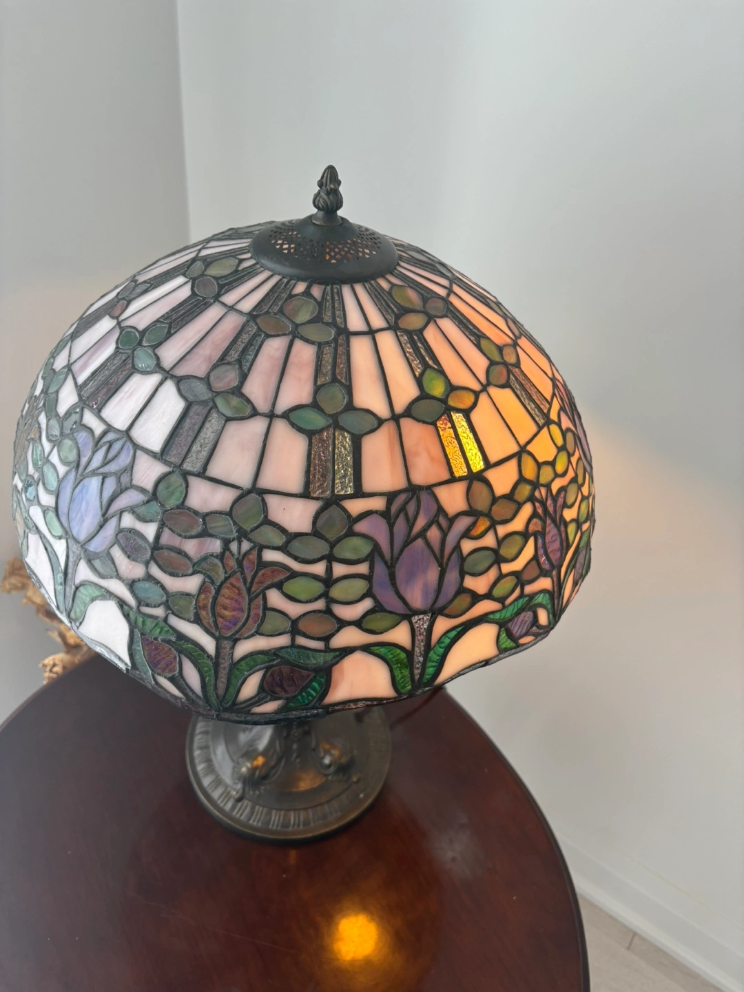 Beautiful stained glass table lamp. Features a dome shade with purple tulips and a dark bronze-coloured base. Elegant design, perfect for a bedside table or living room.