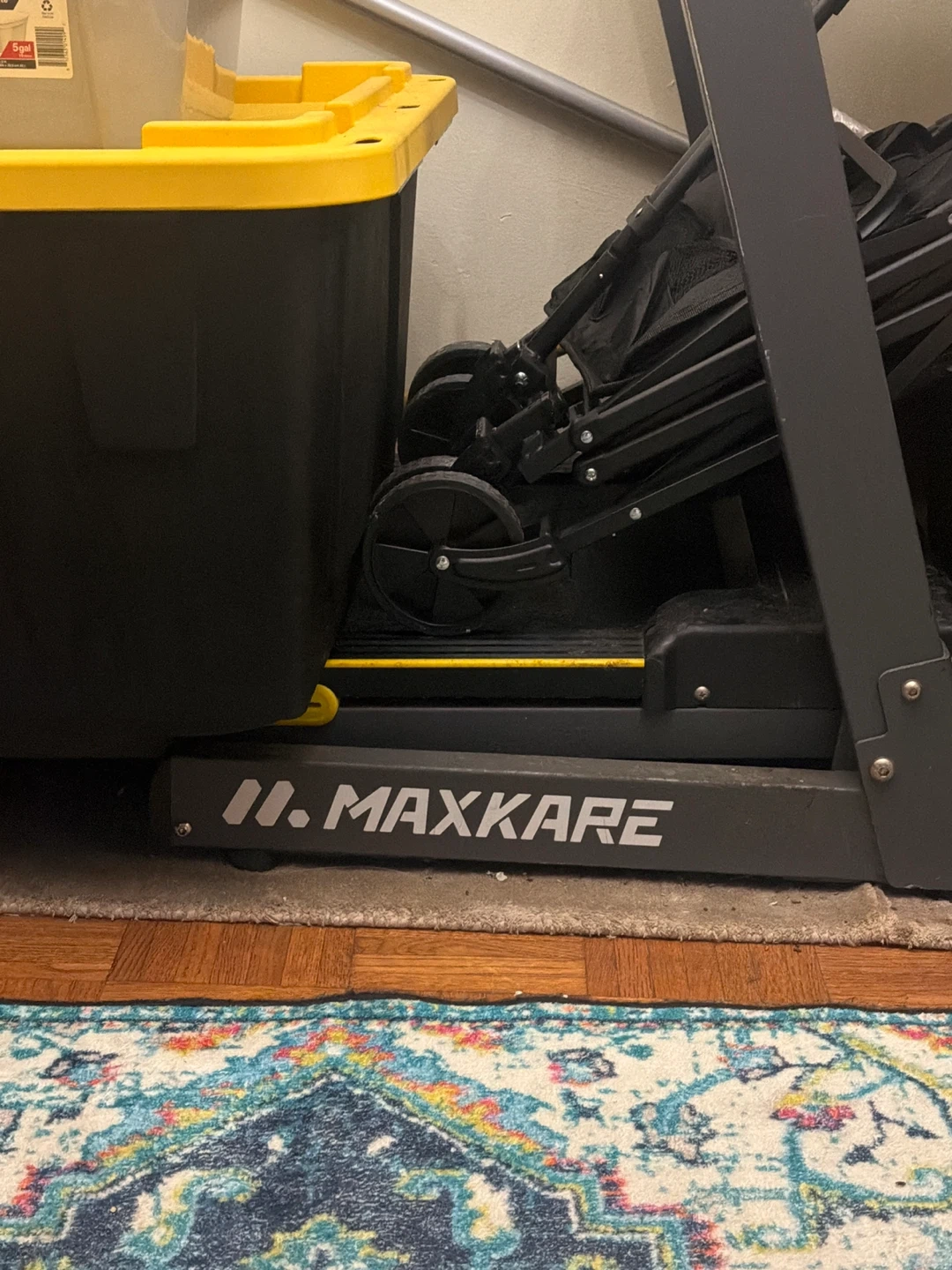 This is a MAXKARE treadmill. It has various programs and a digital display for tracking workouts. Features a start, pause, and stop button. Includes a safety key.