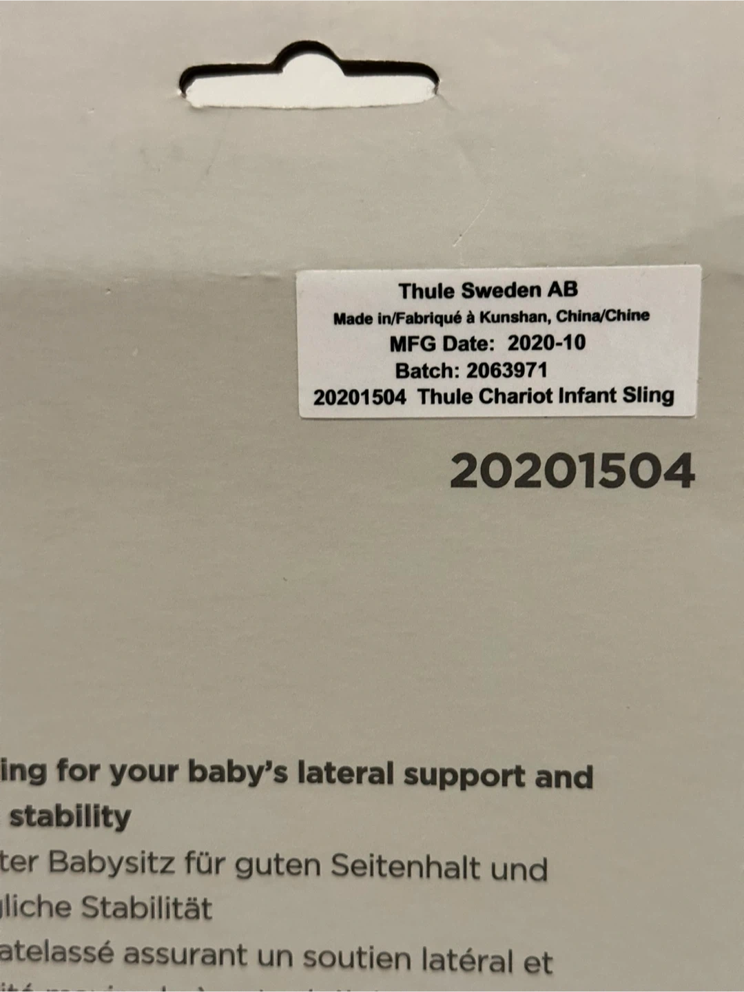 Selling a brand new, open box Thule Chariot Infant Sling! This sling provides lateral support and stability for your baby when using a Thule Chariot carrier. The manufacturing date is October 2020. It comes with the original box.