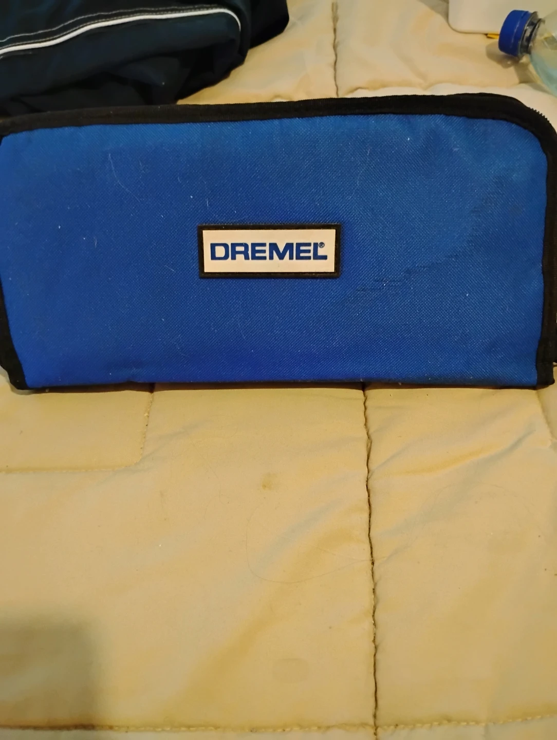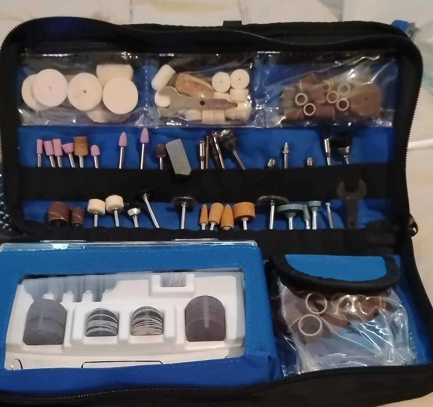 This Dremel accessory kit comes in a blue carrying case. It includes various bits for cutting, grinding, and polishing. Great for DIY projects and craftwork!