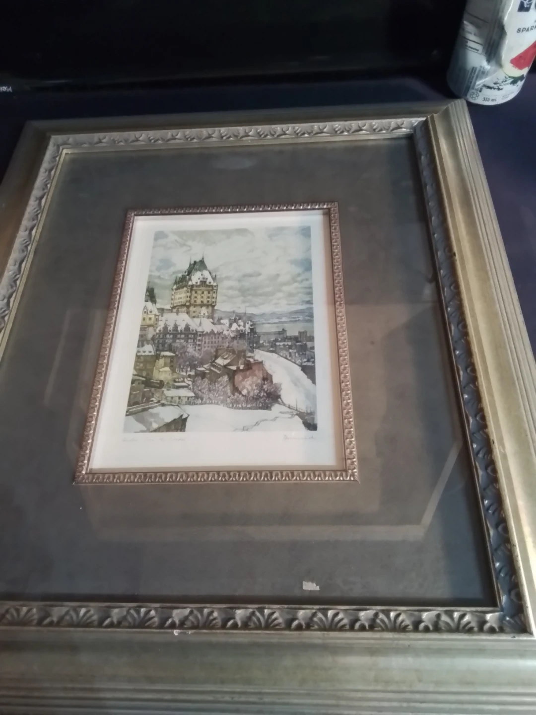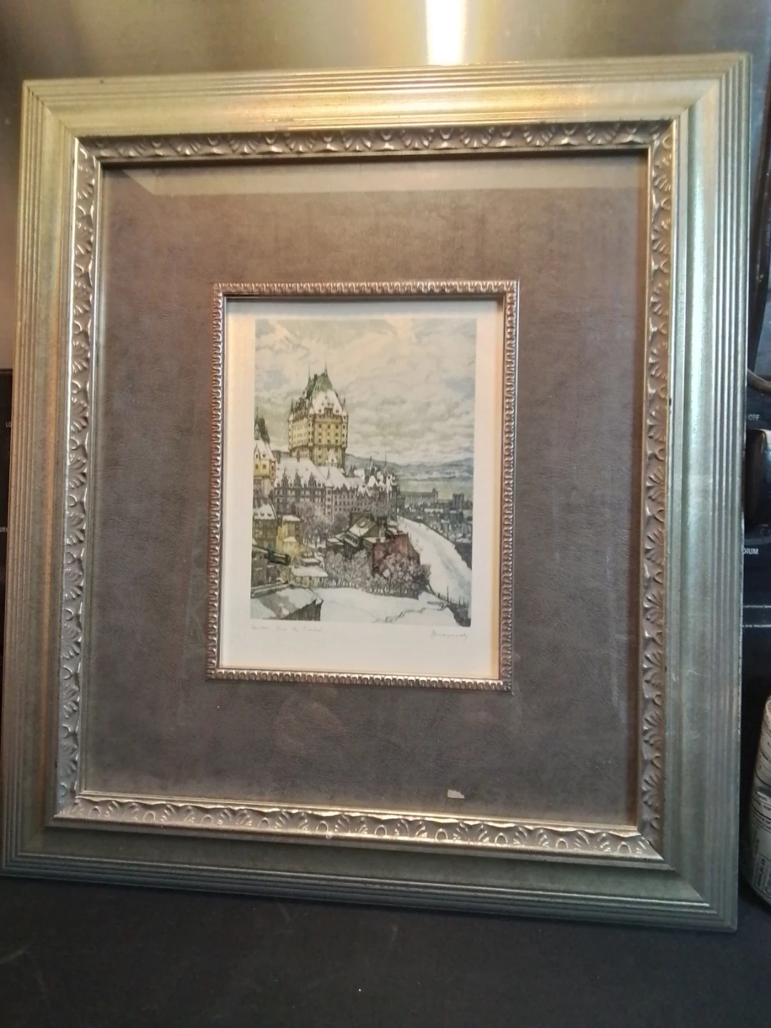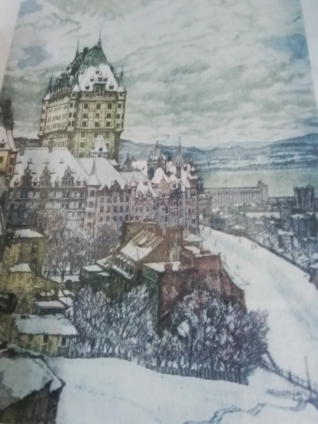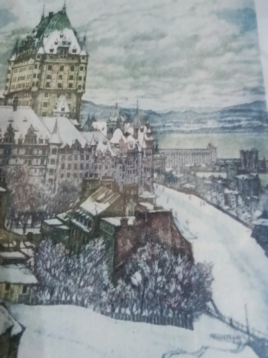 This Aquantite depicts Quebec City in winter, showing the iconic Fairmont Le Château Frontenac. The artwork is signed by the artist. It's a lovely piece for any art collector or someone who appreciates Canadian landscapes.