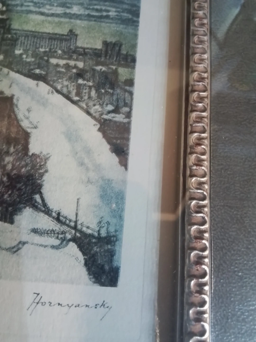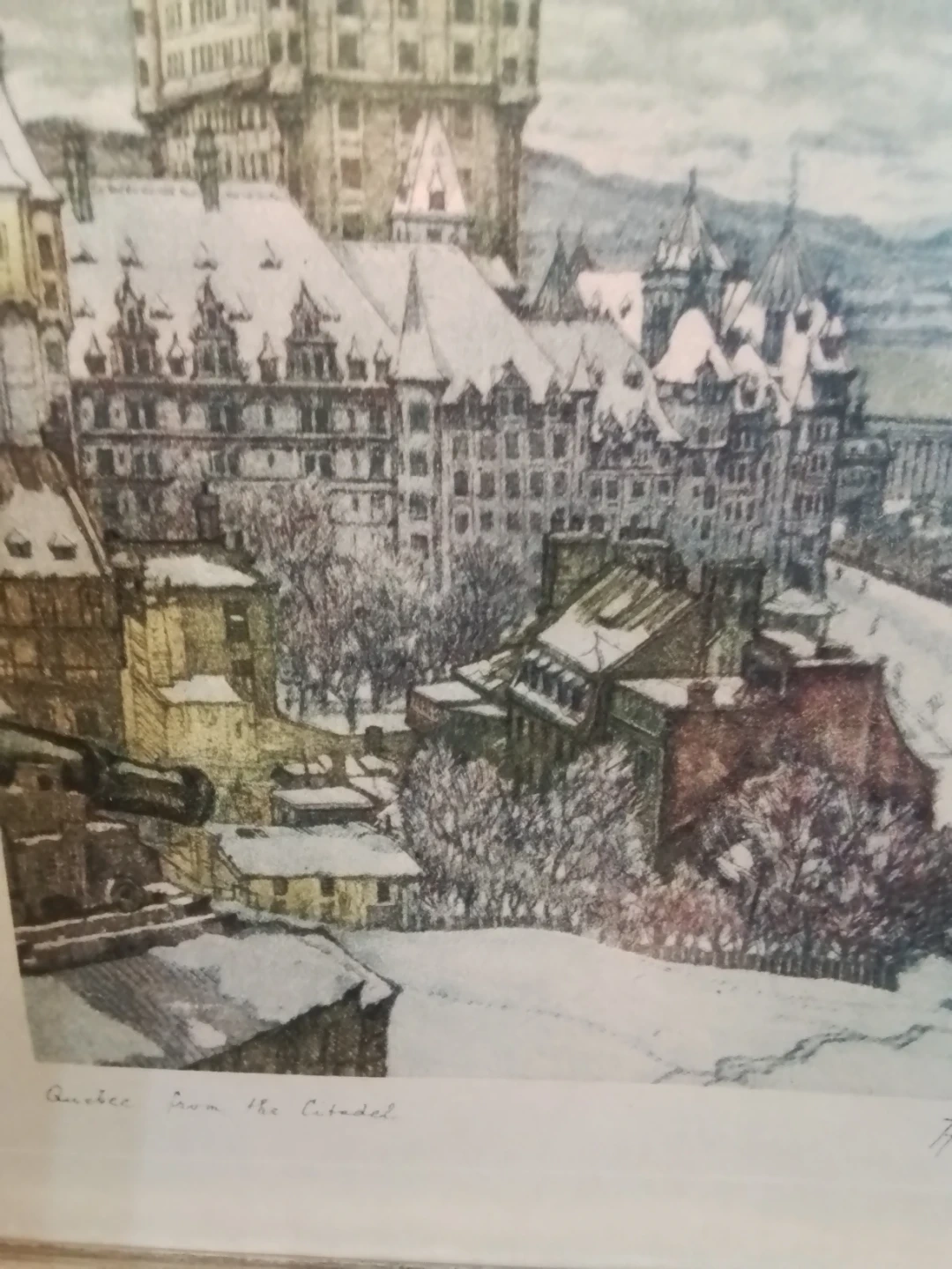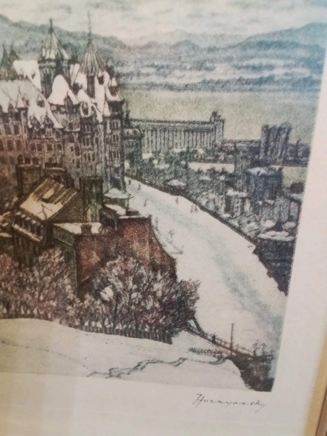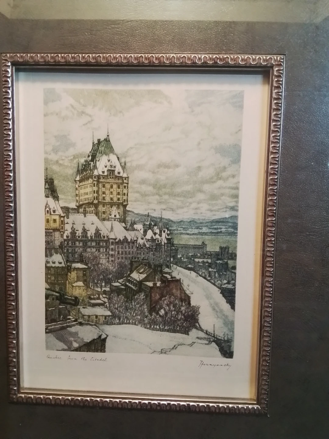 This is a vintage Aquantite print by Hornyansky, titled 'Quebec from the Citadel', framed in a 15.5x17.5 inch frame. The print is in good condition, showcasing a detailed view of old Quebec. It's a beautiful piece for anyone who appreciates fine art and cityscapes.