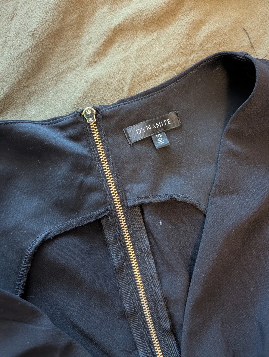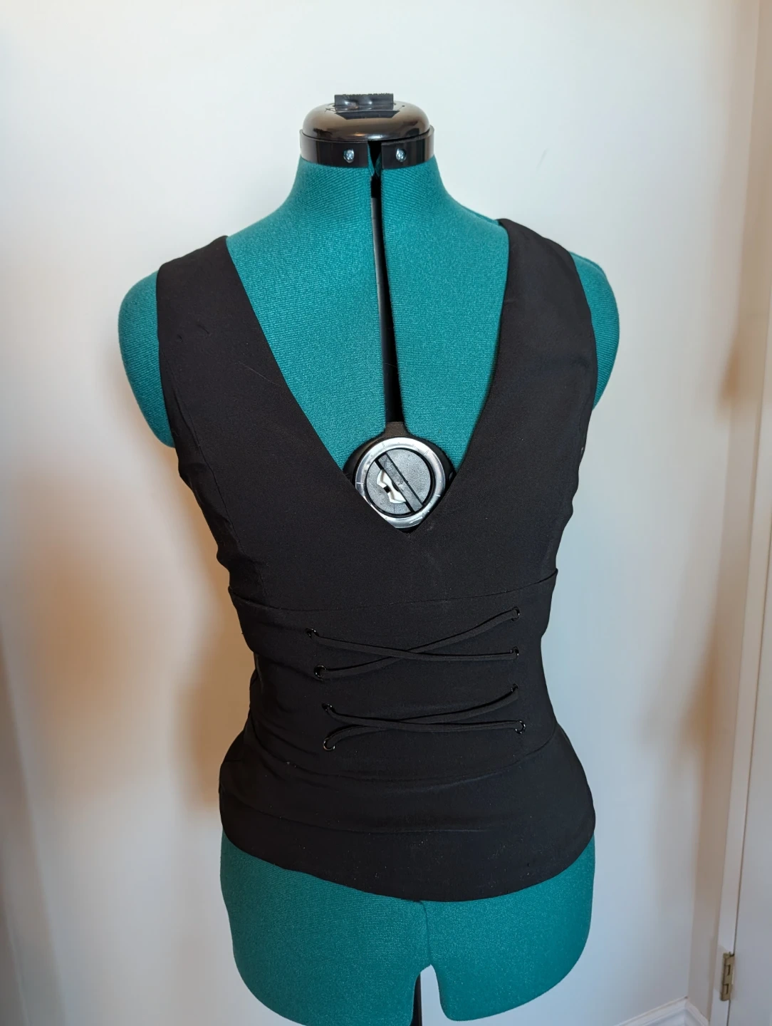 This Dynamite sleeveless V-neck top is black. It features a lace-up detail on the front and a zippered closure. The material is a polyester blend. It's a size S with some stretch.