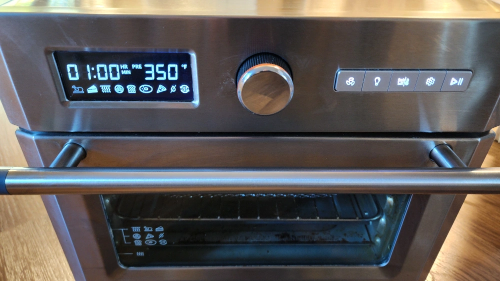 The Vida by PADERNO Air Fryer Toaster Oven, 6-Slice, brings gourmet flair to everyday cooking and helps you create memorable meals for family and friends. The multi-functional air fryer toaster oven combo does it all: air fry, bake, broil, toast, reheat, and more. An internal lamp lets you keep an eye on your creations through the viewing window, ensuring perfect results every time. The included frying basket provides everything you need to make meals for one or six while the intuitive digital display puts precision cooking at your fingertips. Whether you're craving homemade french fries, 12-inch pizzas, or fresh toast for breakfast, this space-saving wonder can handle it with ease. This is in good condition and works well. Not needed due to moving.