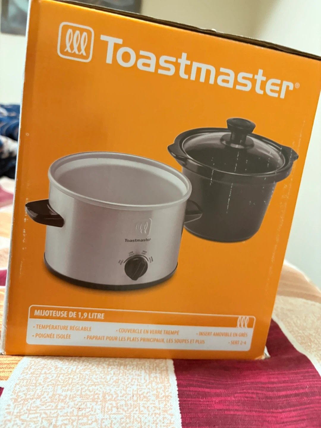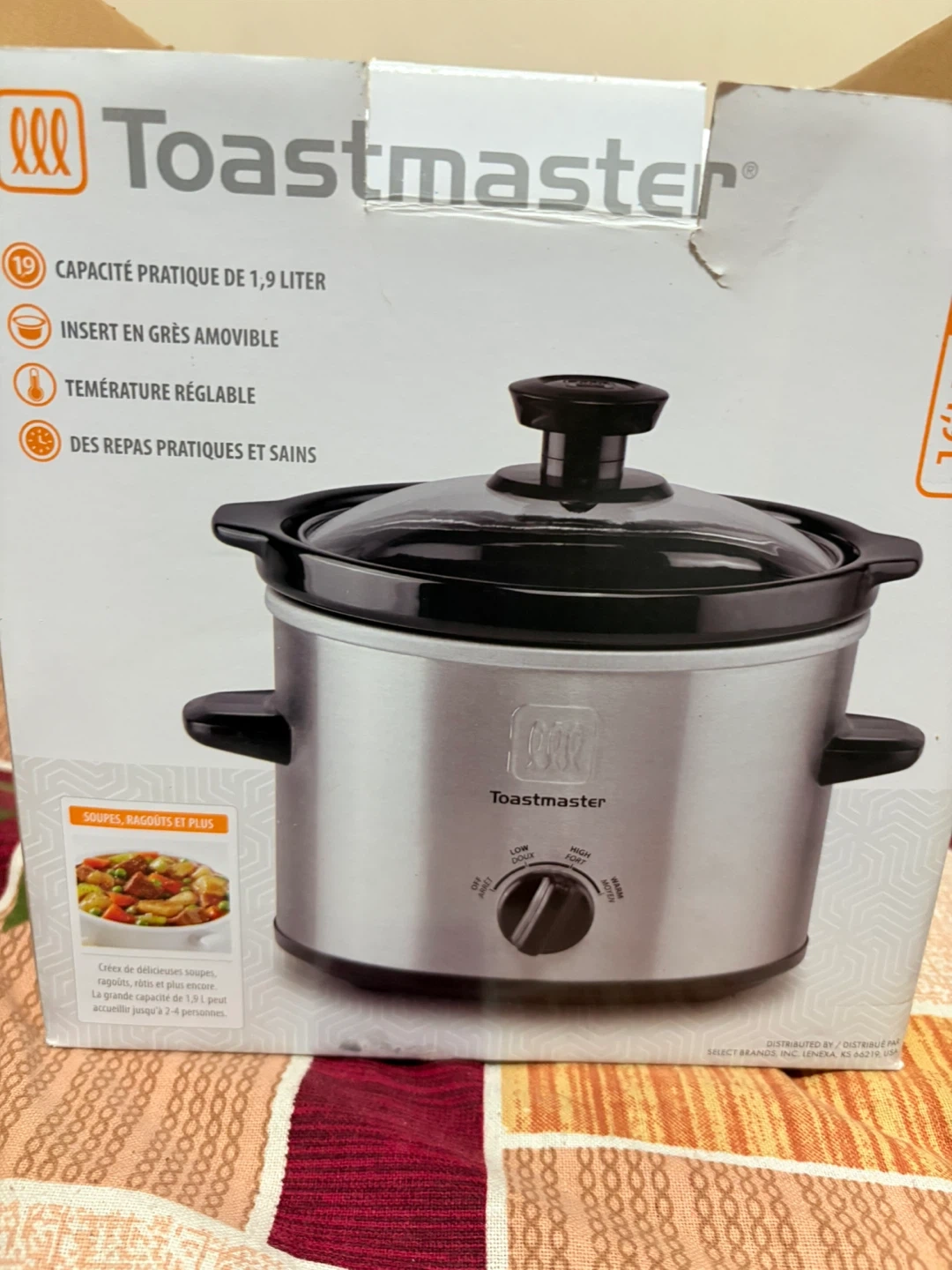 Selling a brand new Toastmaster slow cooker! It has a 1.9 liter capacity, perfect for soups, stews, and more. The temperature is adjustable, and it comes with a removable stoneware insert. The box is included!