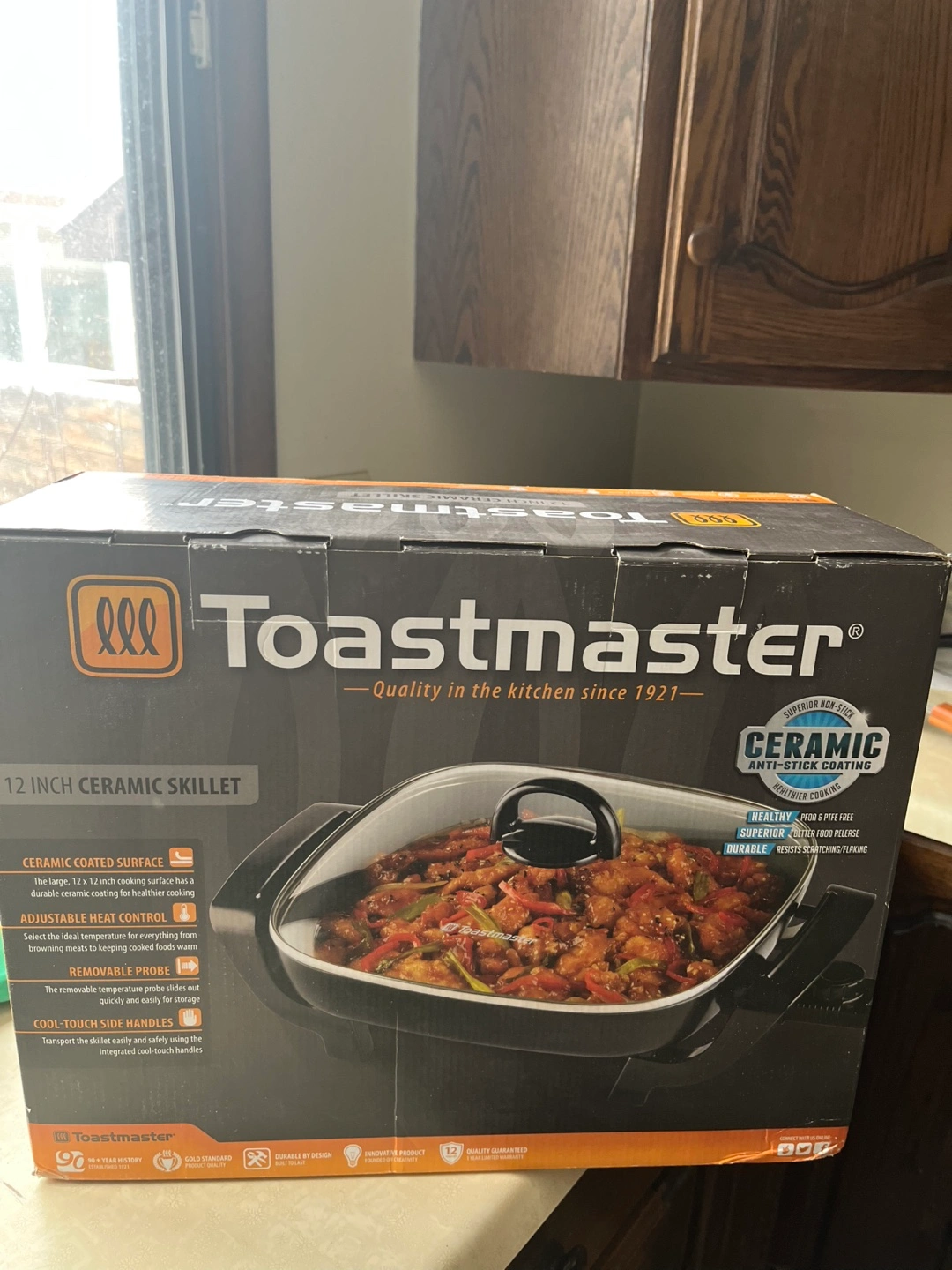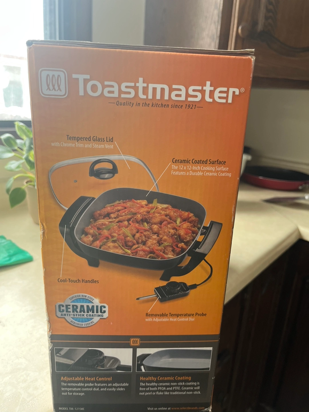Model TM - 121SKC New in box. Sealed. 12 x 12 inch ceramic coated cooking surface. Features a durable ceramic coating. Adjustable heat control. Removable temperature probe with adjustable heat control dial. Cool-touch handles. Tempered glass lid with chrome trim and steam vent. Retails for $150 on amazon