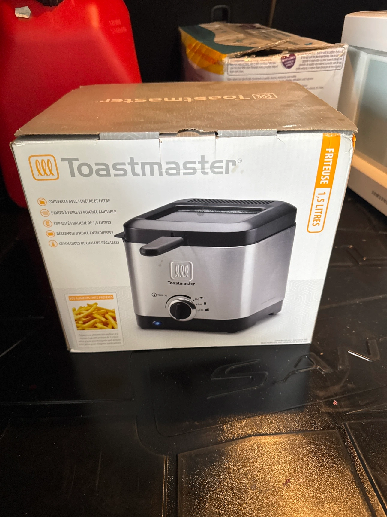 34This is a like new, opened deep fryer from Toastmaster with a capacity of 1.5 litres. It features a removable basket, non-stick coating, adjustable temperature control, and a viewing window.