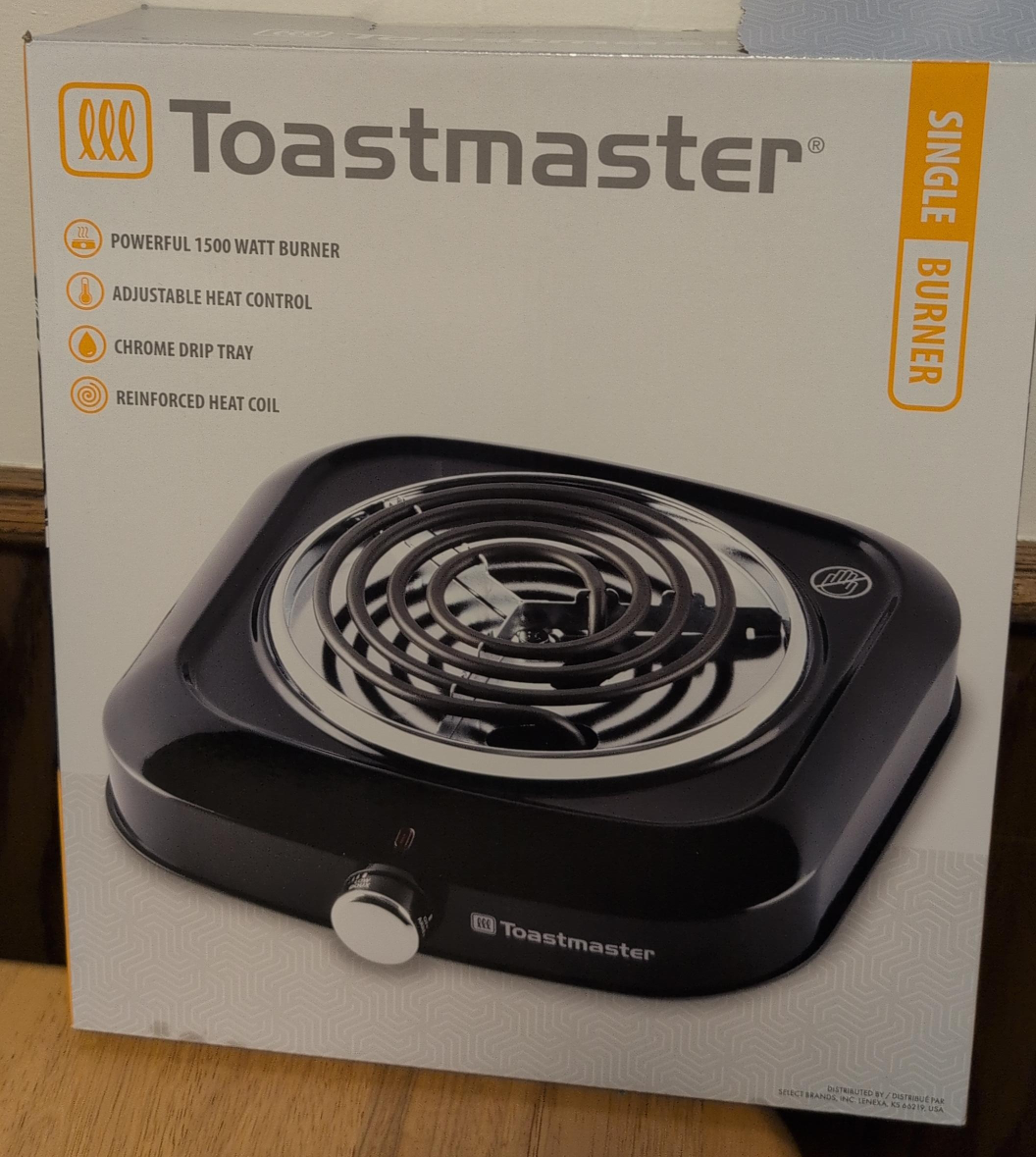 15Selling a Toastmaster single burner. It's in like-new condition and comes in the original box! Features include: - Powerful 1500 watt burner - Adjustable heat control - Chrome drip tray - Reinforced heat coil