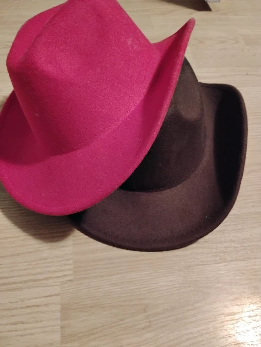 These are fun felt cowboy hats. They're made of 65% cotton and 35% polyester. Available in bright pink and brown colours. These hats are great for parties or dress-up!