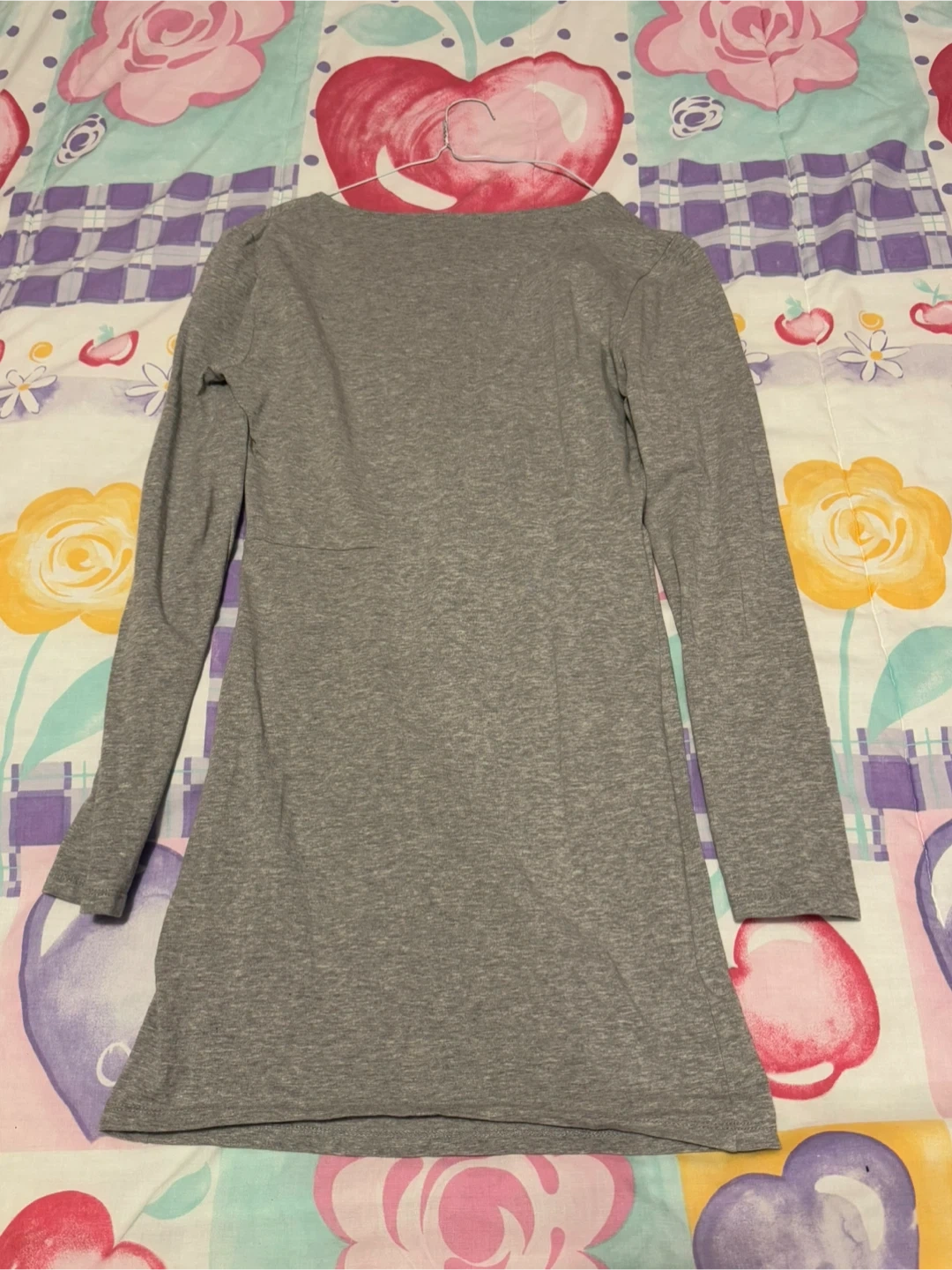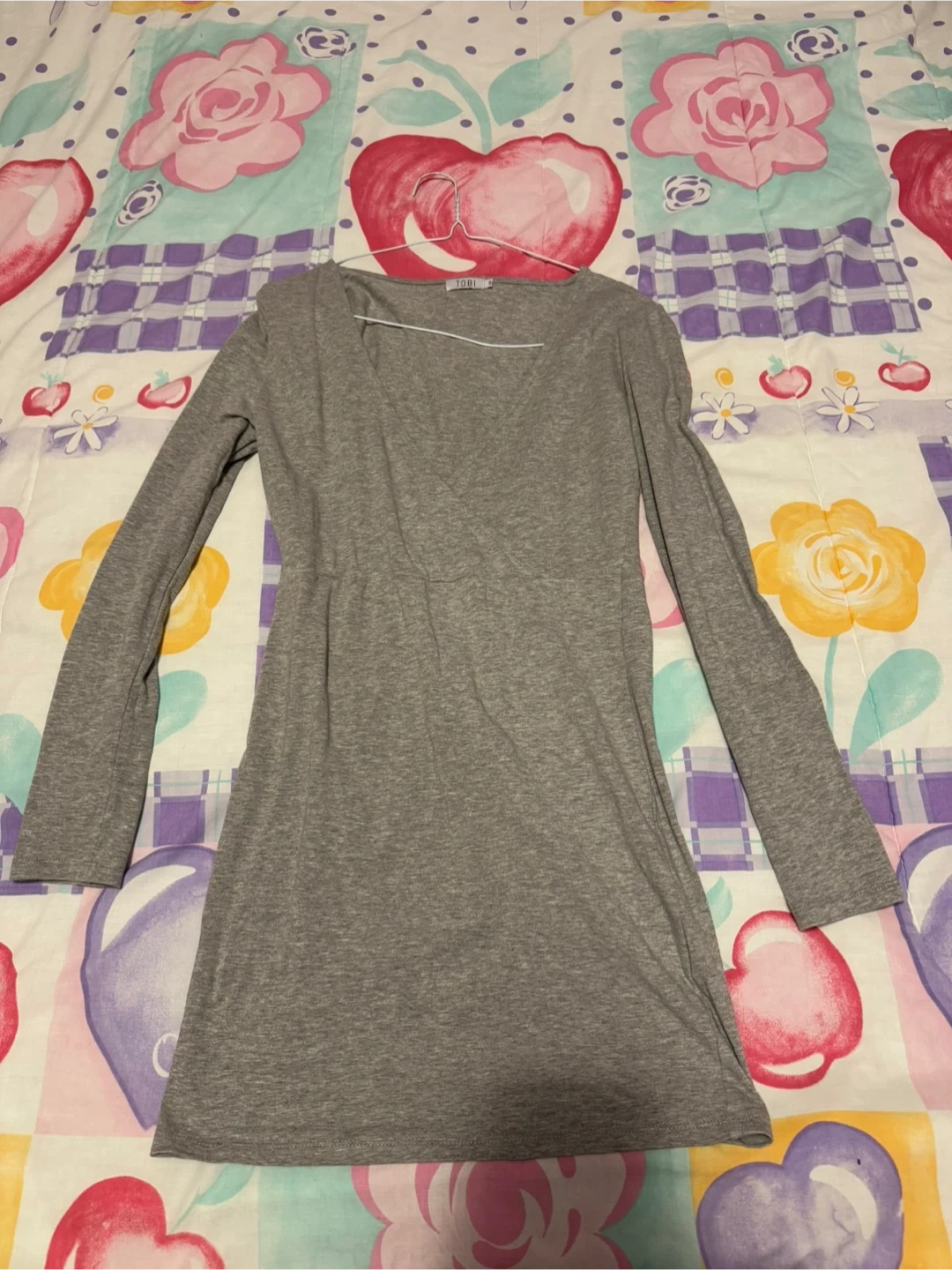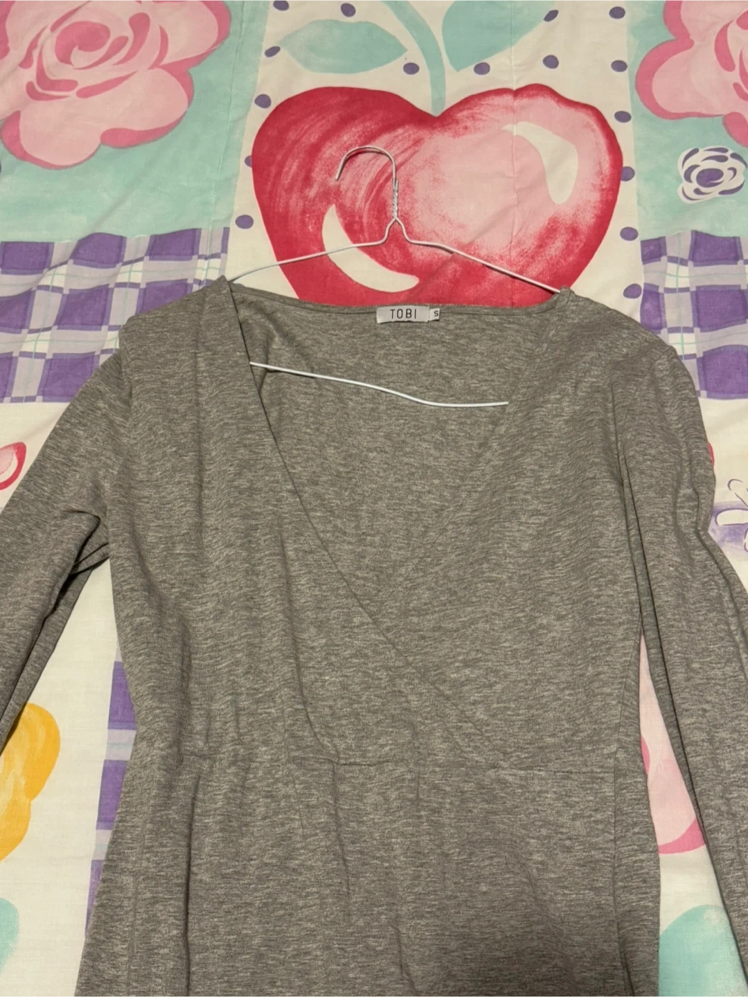 295Selling a cute grey long-sleeve wrap front dress from TOBI! It's a size small and in great condition. Perfect for a casual day out or dressing up for an evening. It has a flattering fit and is super comfy!