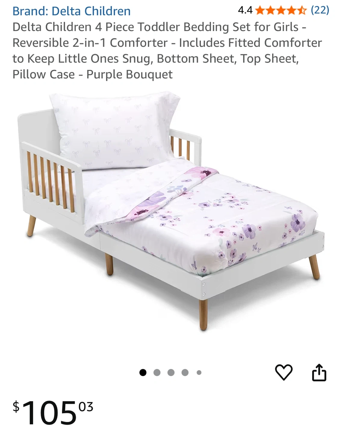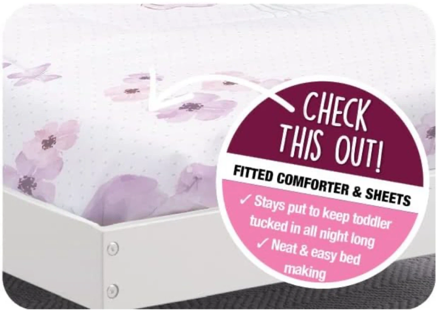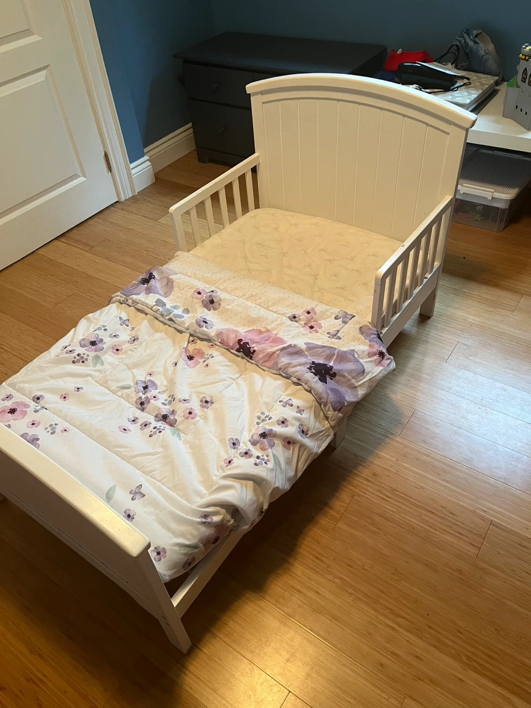 18Toddler bed, mattress, and delta children 4-piece toddler bedding set. It features a reversible 2-in-1 comforter, a fitted comforter to keep your toddler tucked in all night long, a fitted bottom, a fitted top sheet, and a pillowcase, all in a sweet purple bouquet design. Bedding set alone was originally bought for $105.03. Can include two mattress protectors as well as additional fitted bottom sheets for additional price if interested.