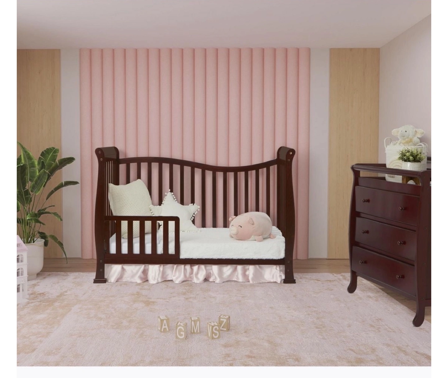 Brown wooden toddler bed with rails and a white mattress. The bed is in good condition and has a pink ruffle around the bottom.