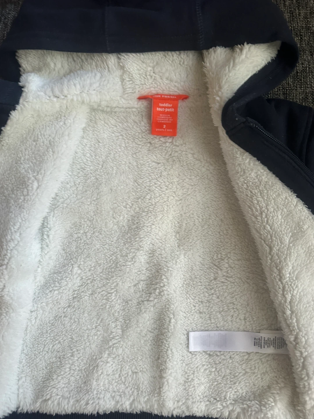 This Deux par Deux toddler's jacket is perfect for keeping your little one warm and cozy, featuring a soft, sherpa-style lining. This used jacket is in good condition and ready for a new home. Features: - Brand: Deux par Deux - Size: Toddler 2 - Colour: Navy Blue - Lining: Sherpa-style - Closure: Zipper See my other listings for more kids' winter clothes, thank you.