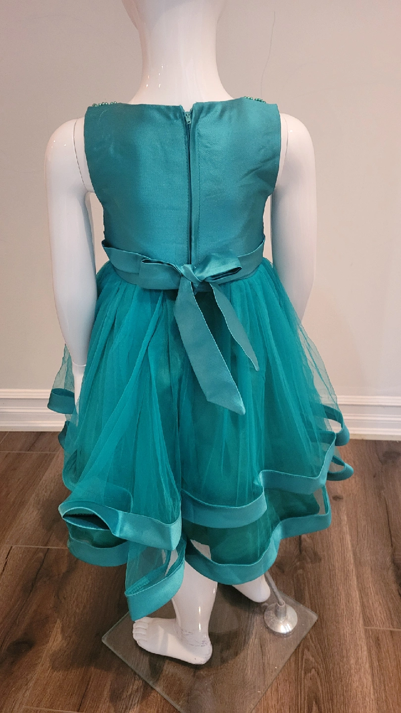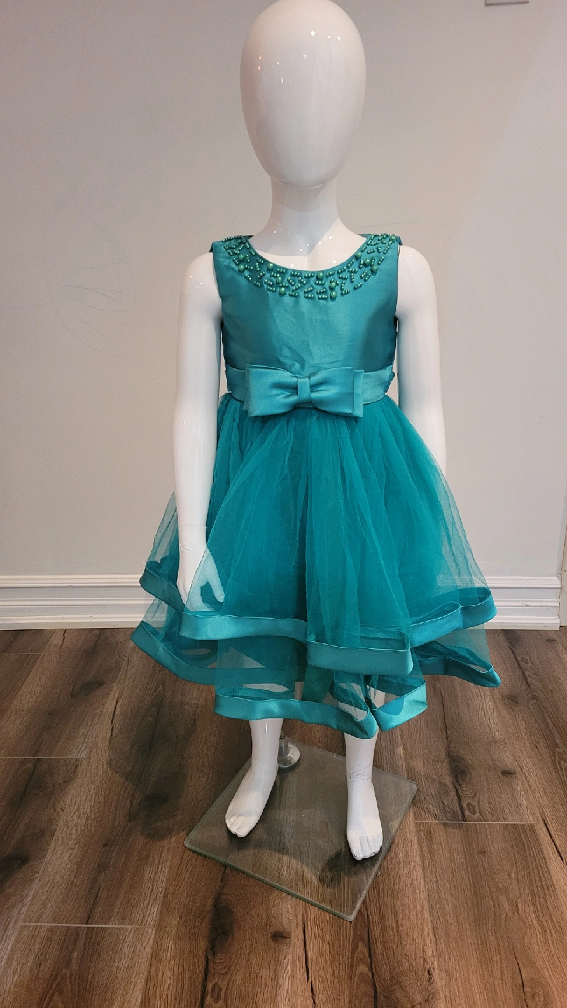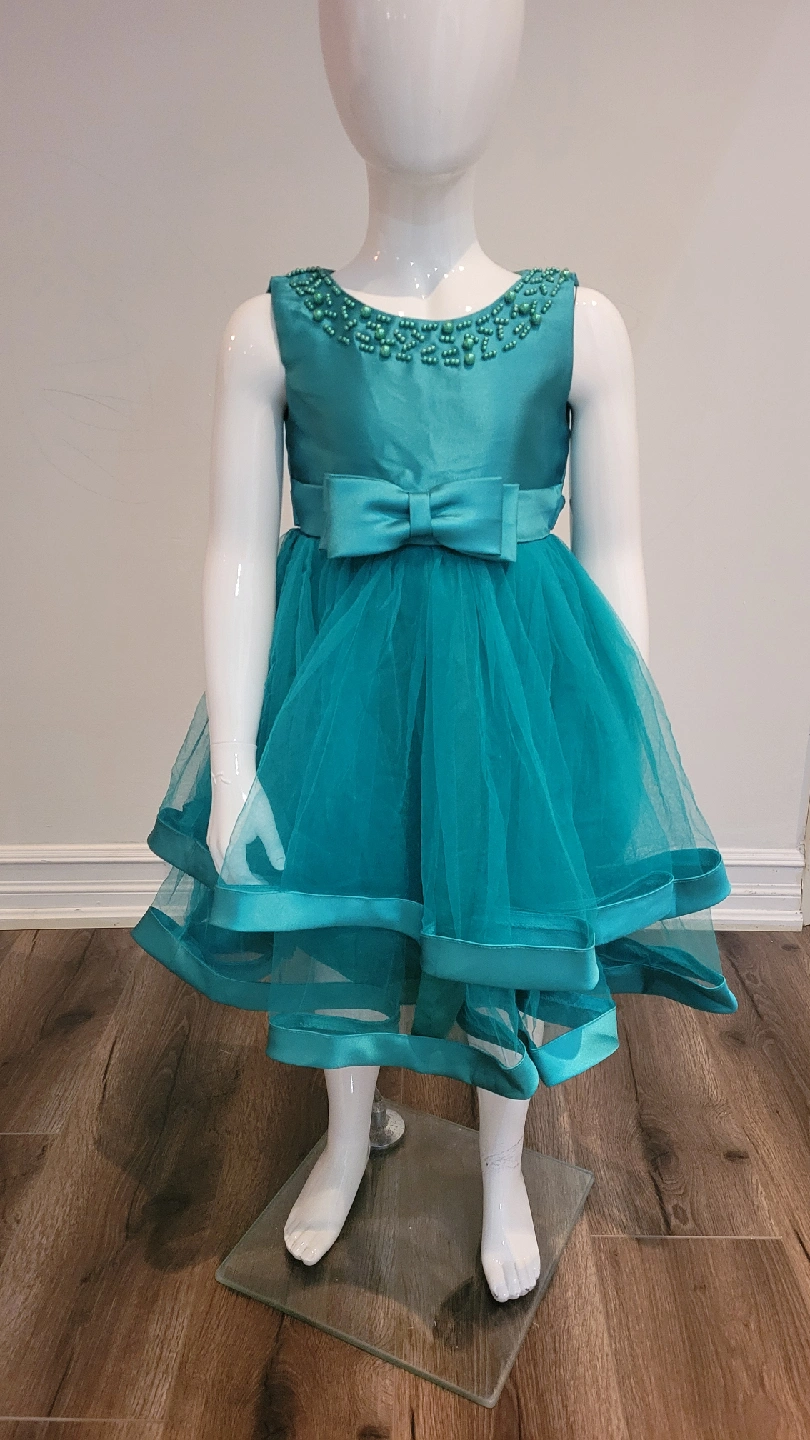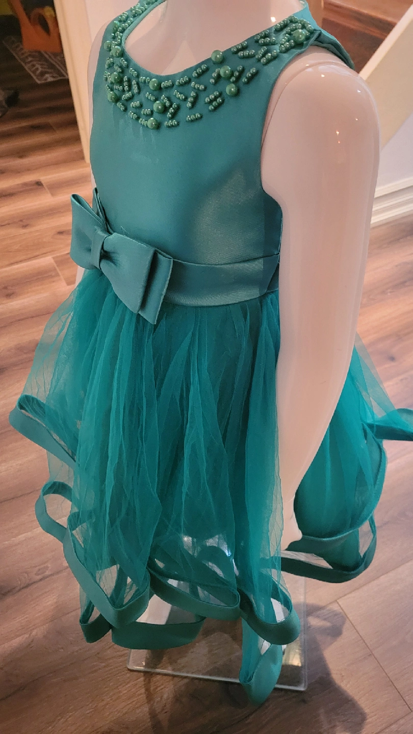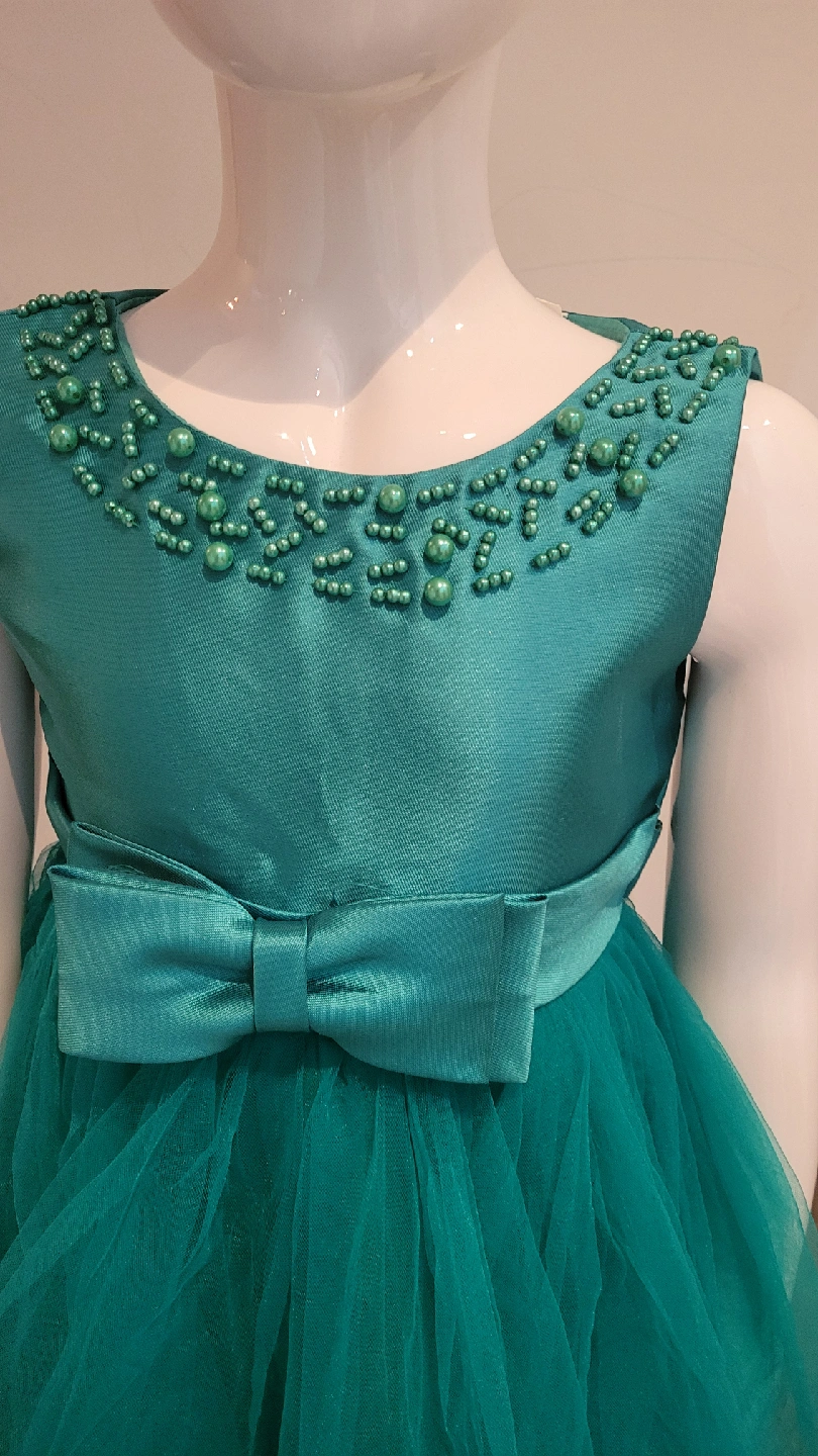 Dark green Pearls beaded baby girl Christmas dress size 4 years old sleeveless dress , as a decorative bow on waist center. Ideal for Christmas Eve