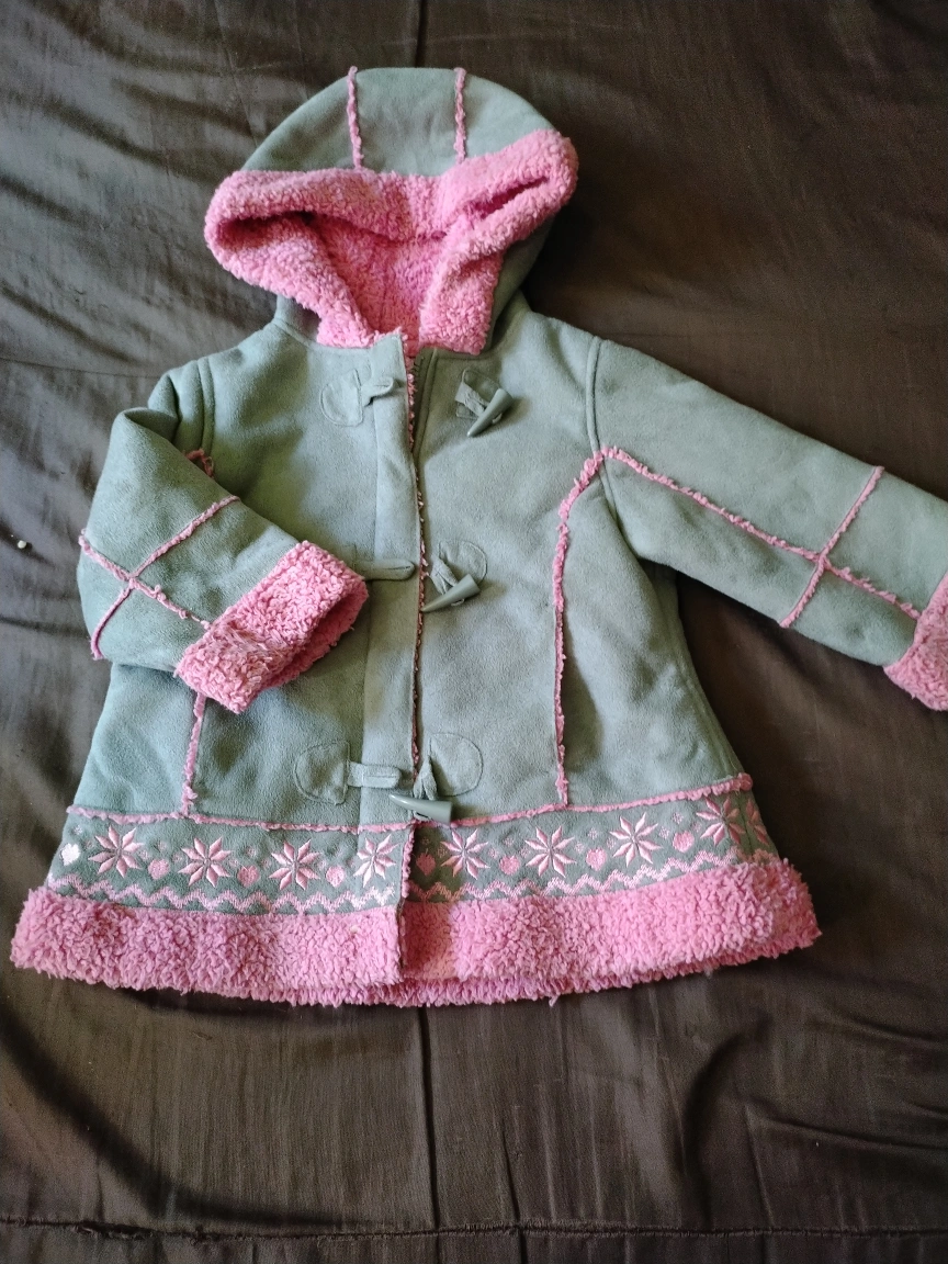 12Selling a cute toddler girl's hooded coat! It features a soft, cozy pink lining and a stylish grey outer layer. Perfect for keeping your little one warm and fashionable during cooler weather