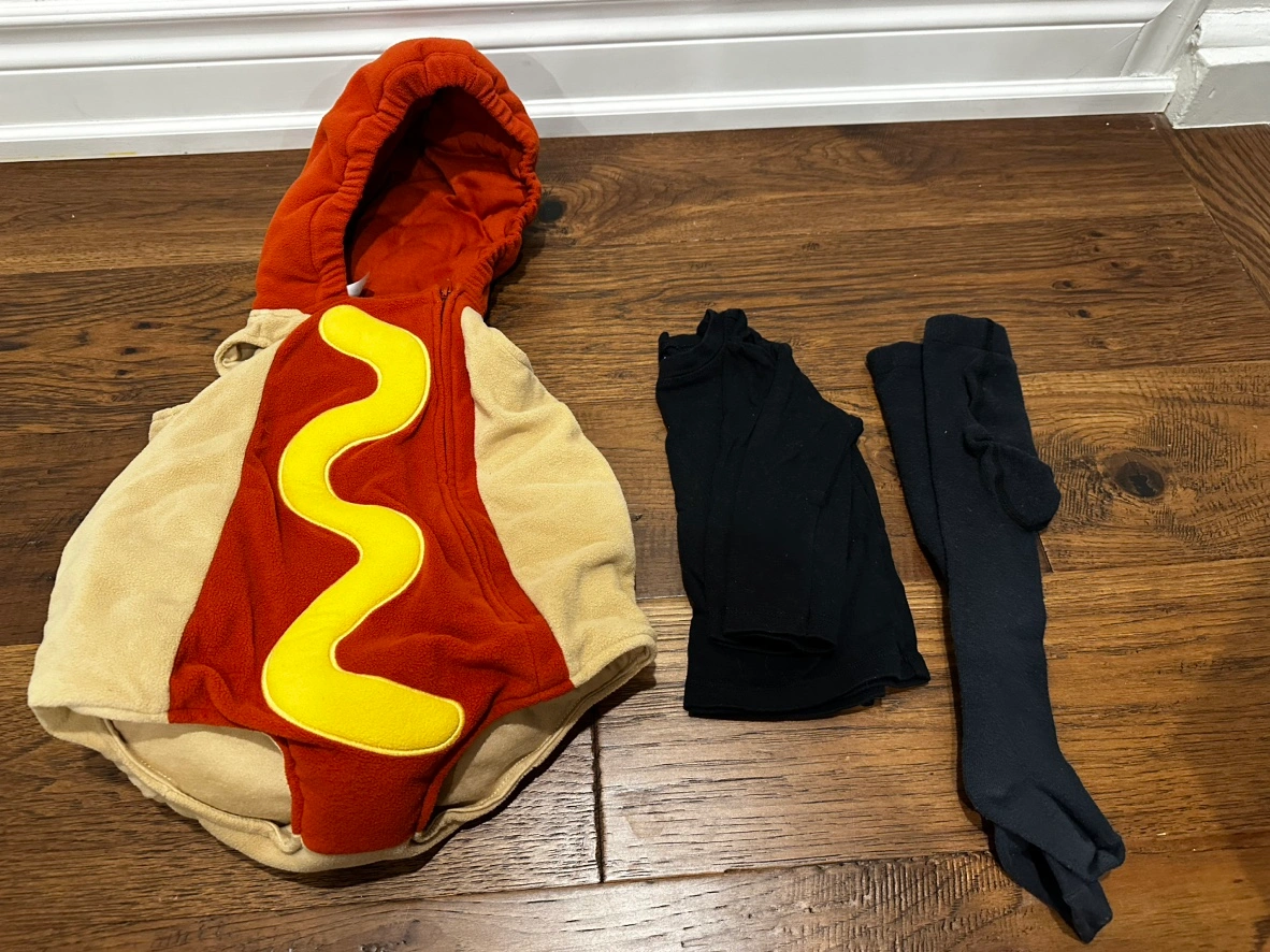 131Toddler Hot Dog - size 18mos - includes black shirt, black tights, cushioned hot dog - only worn once, like new