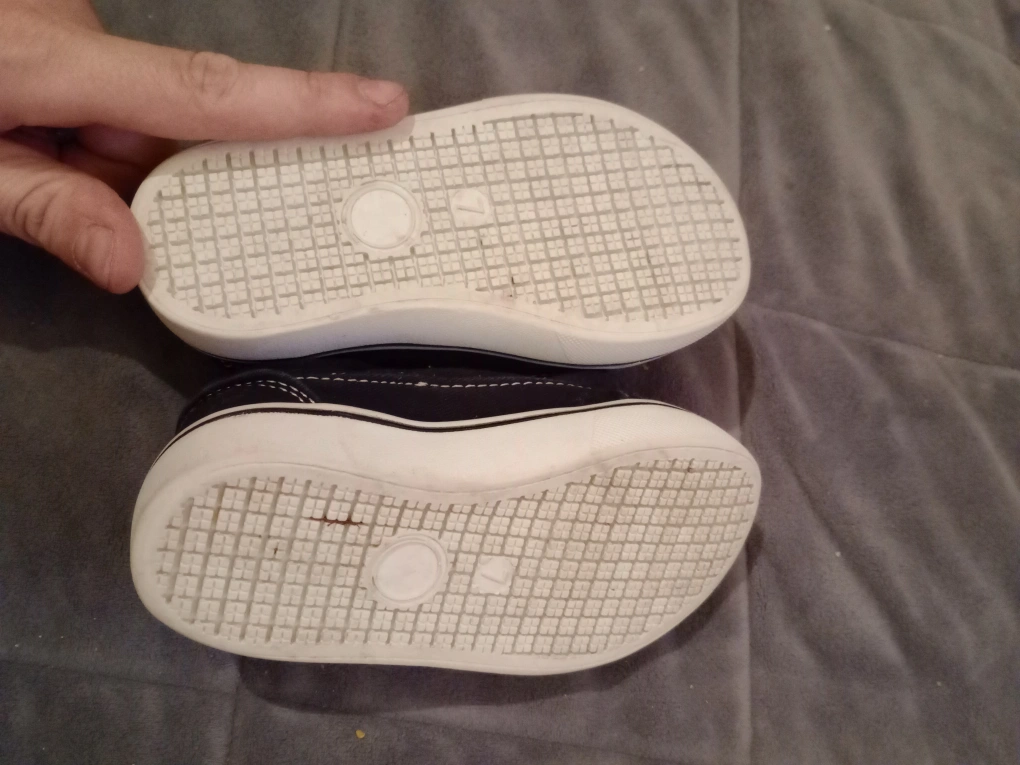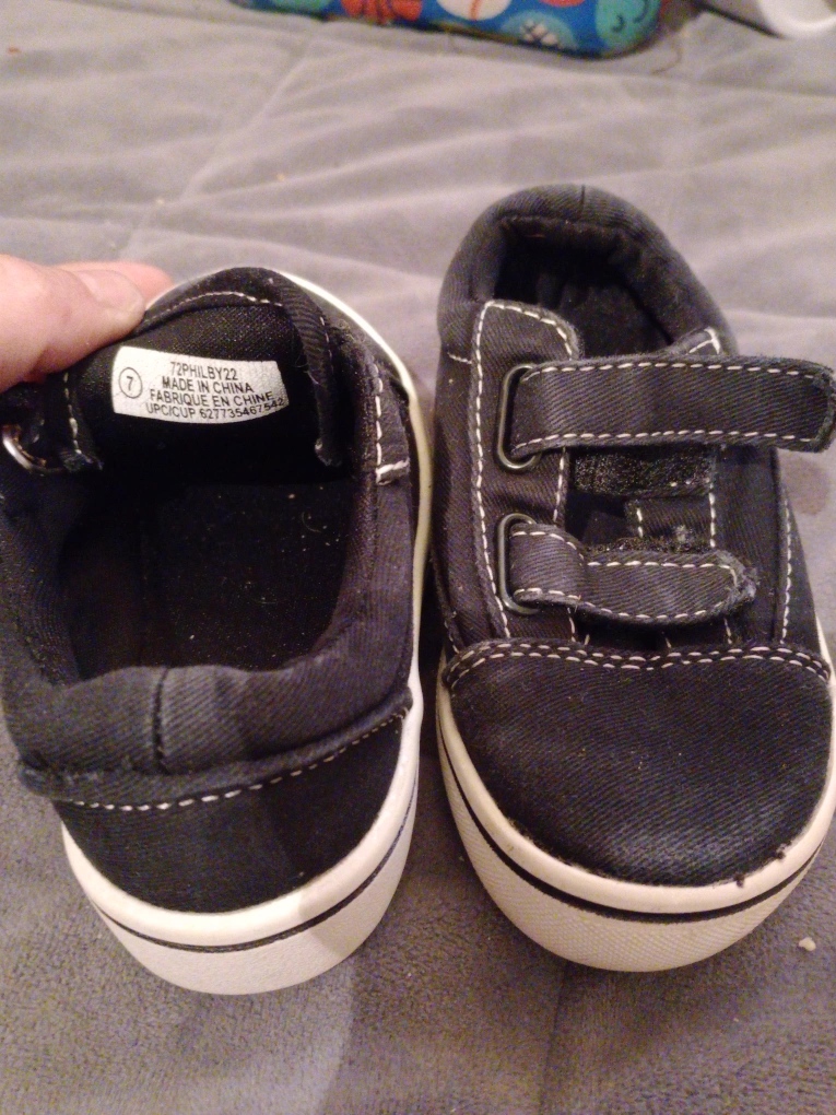 Selling a pair of toddler shoes in size 7. They are black canvas with white stitching and velcro straps. They are in good condition and ready for a new home!