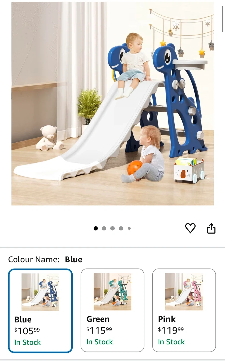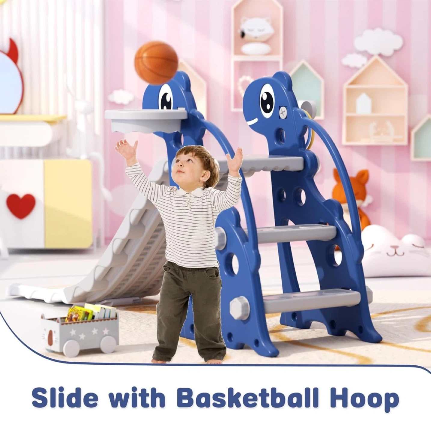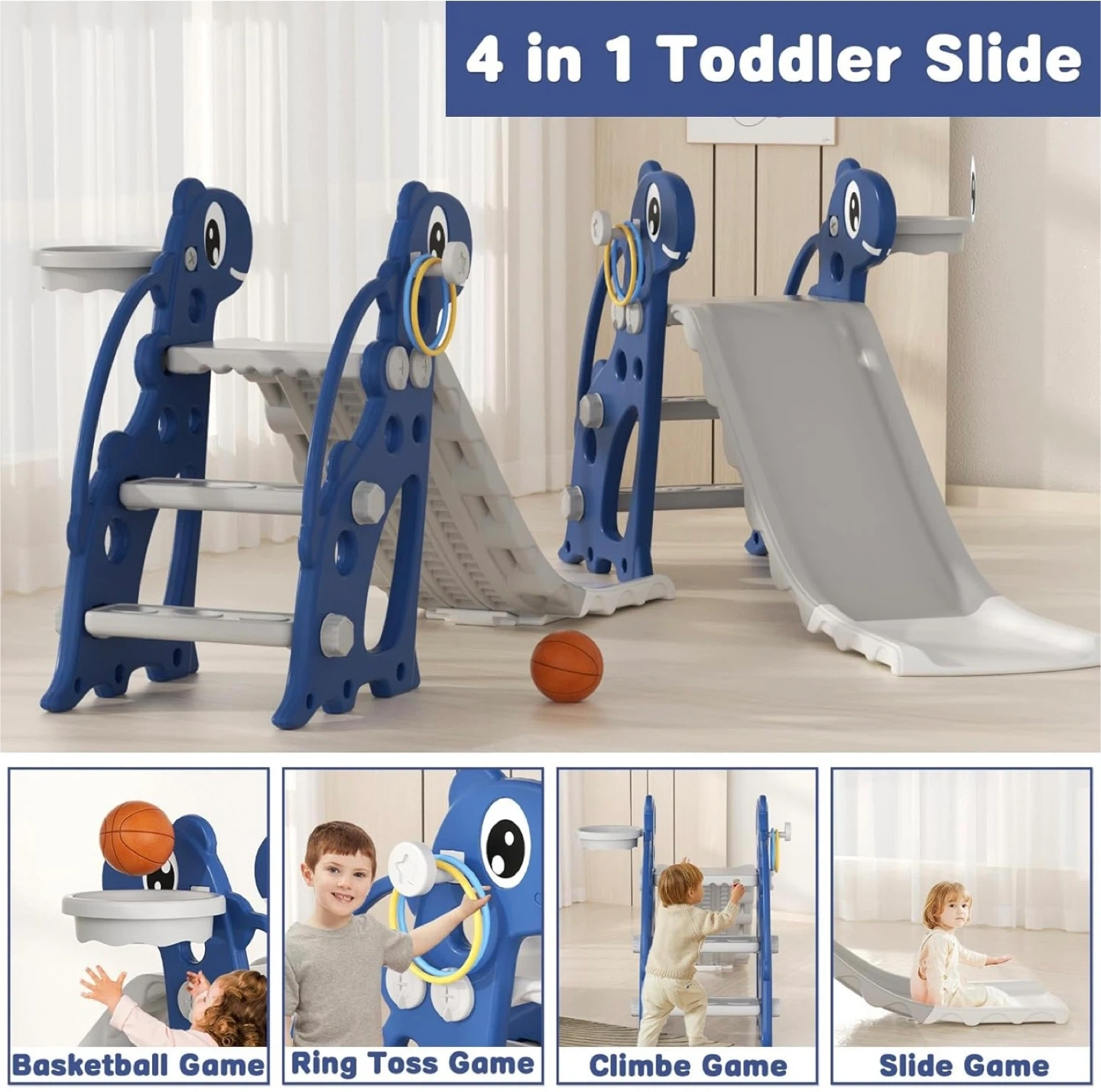 18This is a fun 4-in-1 toddler slide, perfect for ages 1-3! It features a slide, basketball hoop, ring toss game, and climbing ladder, so there's lots to keep the little ones entertained. The slide is blue and has a cute design. Dimensions are approximately 54.72 inches long, 26.77 inches high, and 14.25 inches wide.