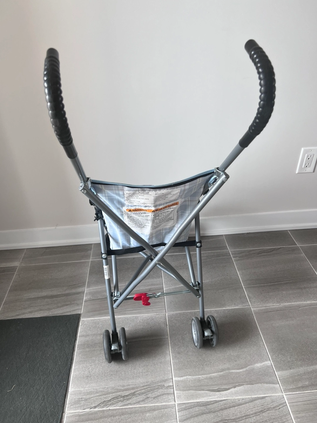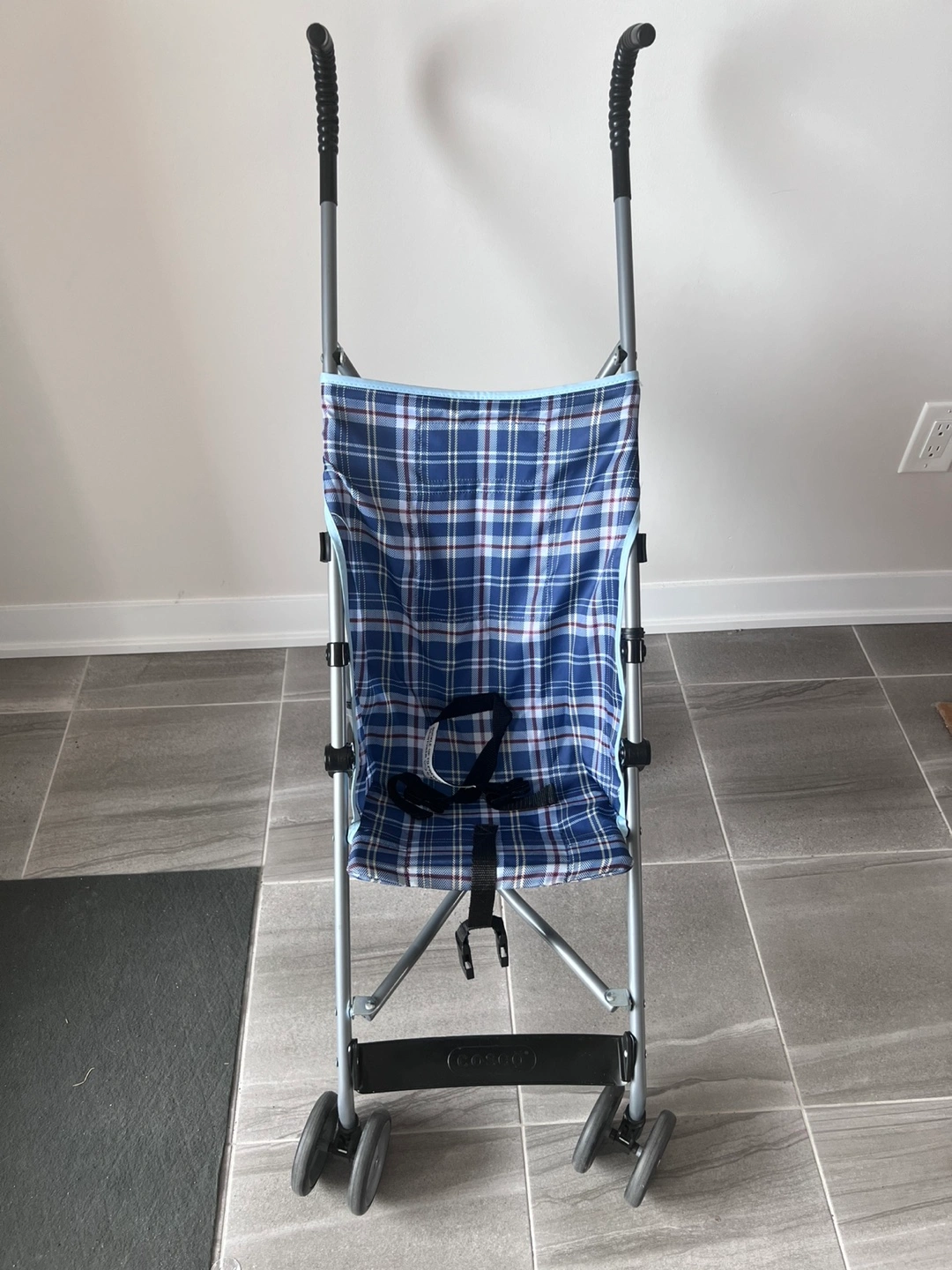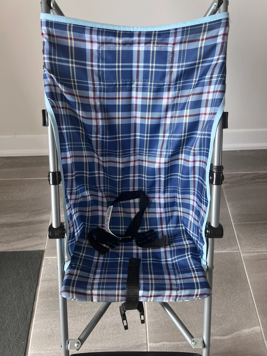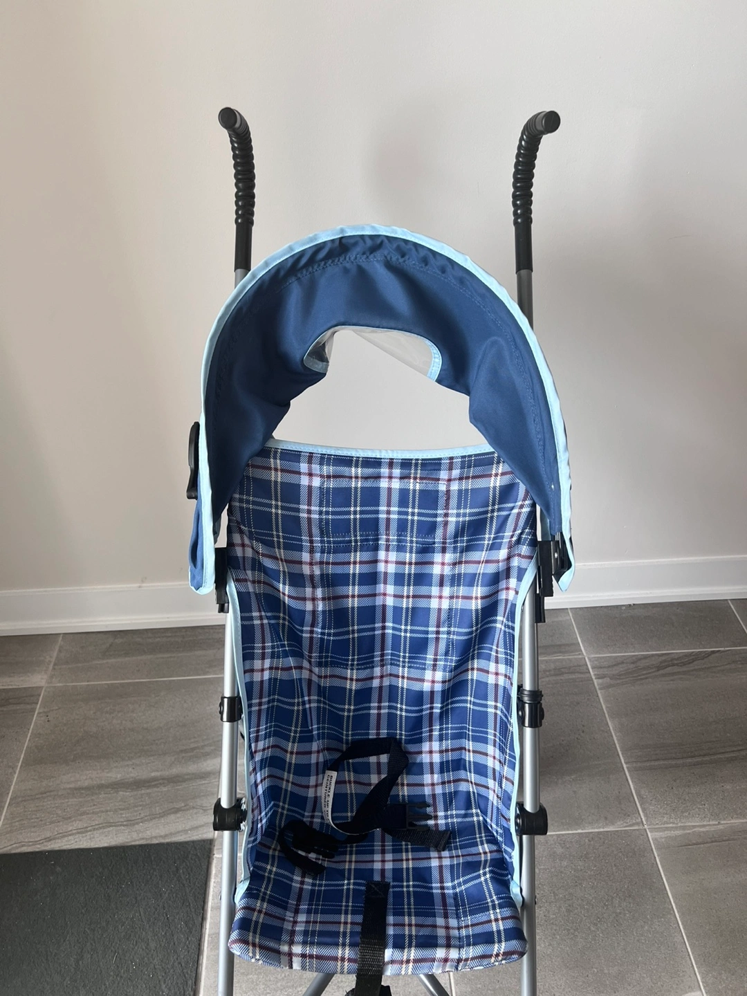 64Selling a Dorel Juvenile Group umbrella stroller in good condition. It features a blue plaid design and is lightweight for easy portability. Perfect for quick trips and travel with your little one!