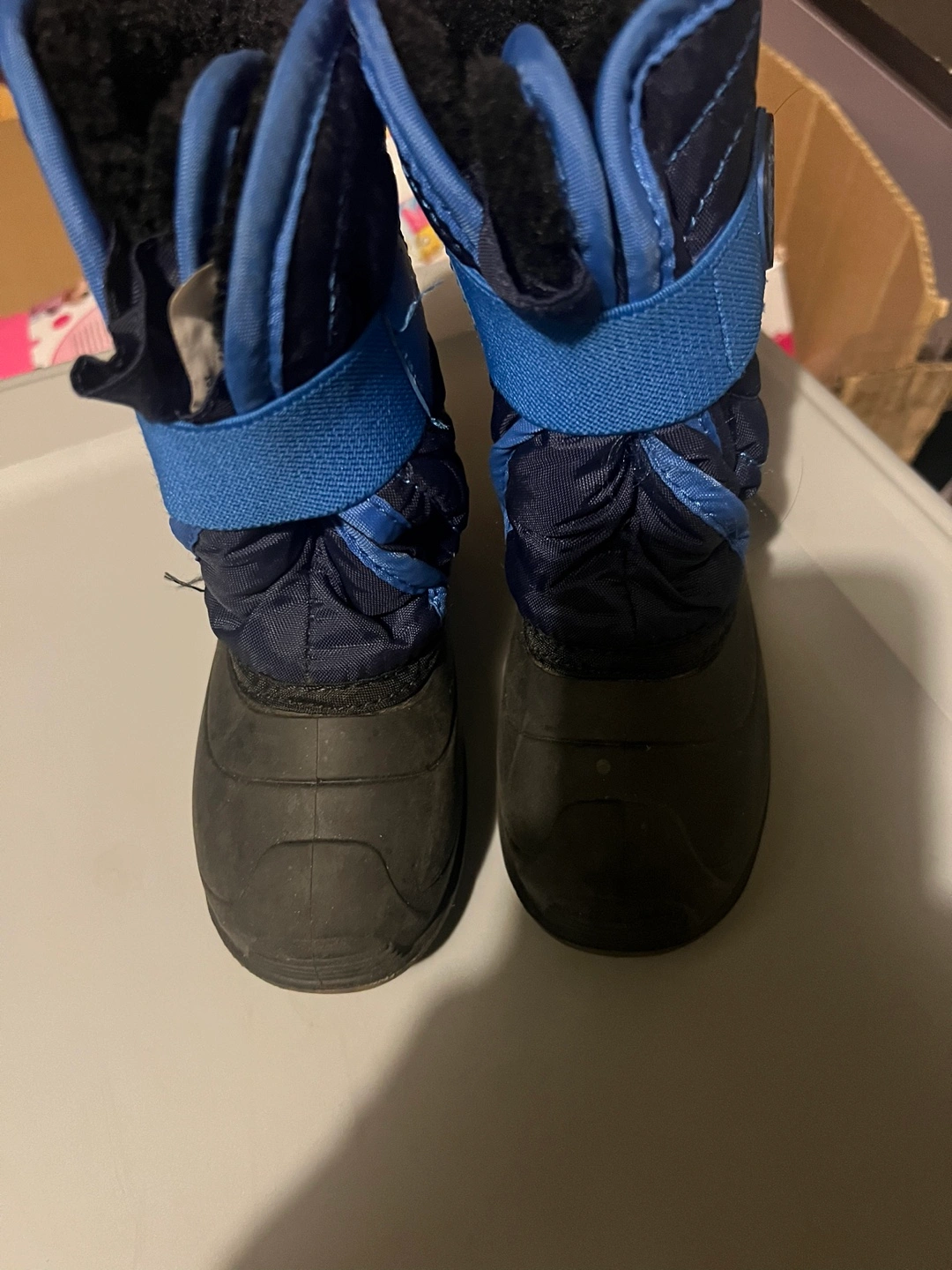 Pair of toddler winter boots. Features a blue and black design. With straps at the top. Perfect for keeping your little one's feet warm in the cold. 8t