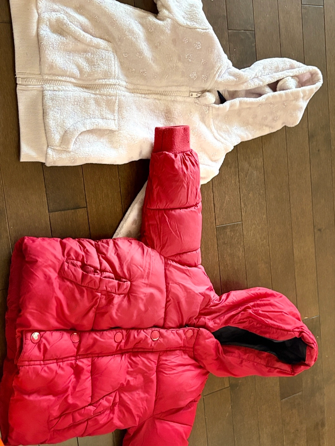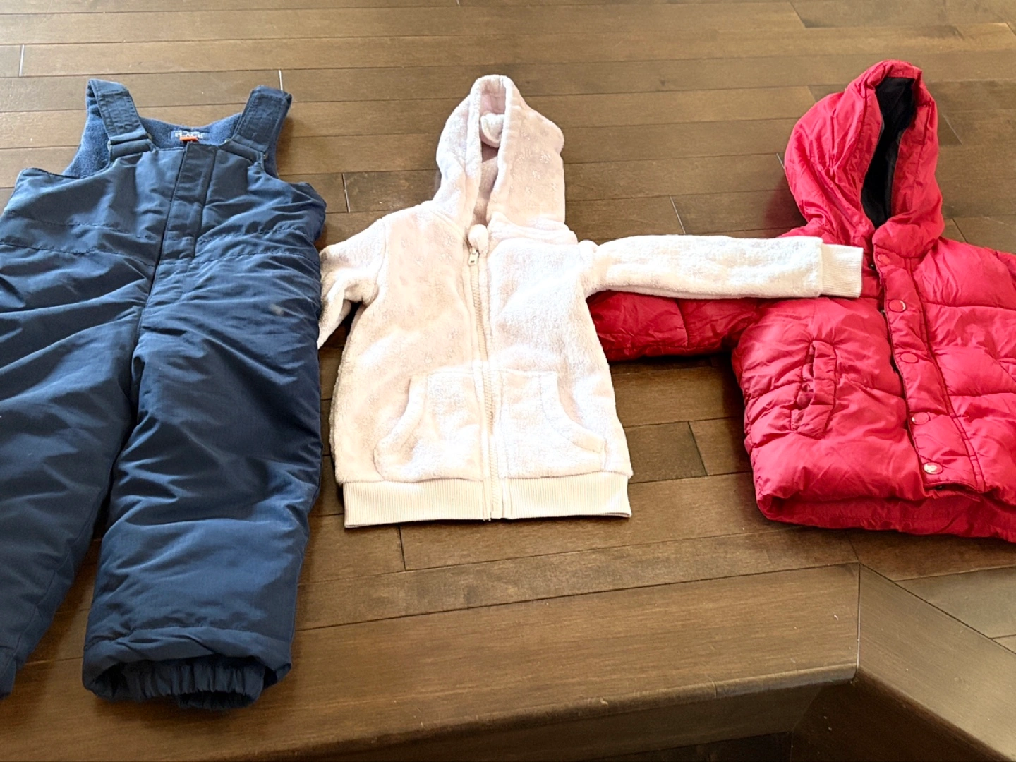Three-piece toddler winter outfit bundle. Includes navy blue snow pants, a cream-coloured fleece hoodie, and a red puffer jacket. Great for keeping your little one warm during the cold winter months. Pre-owned, gently used.