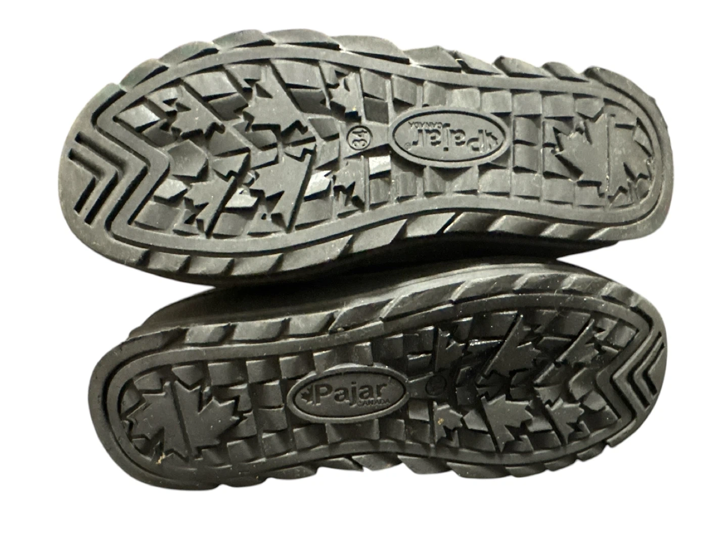 Pajar Canada winter boots for kids. Black colour with fur lining. Lace-up front with side zipper. Water-resistant material. Great for keeping feet warm and dry in the snow! Small tear on fabric under zipper and wear on toes.
