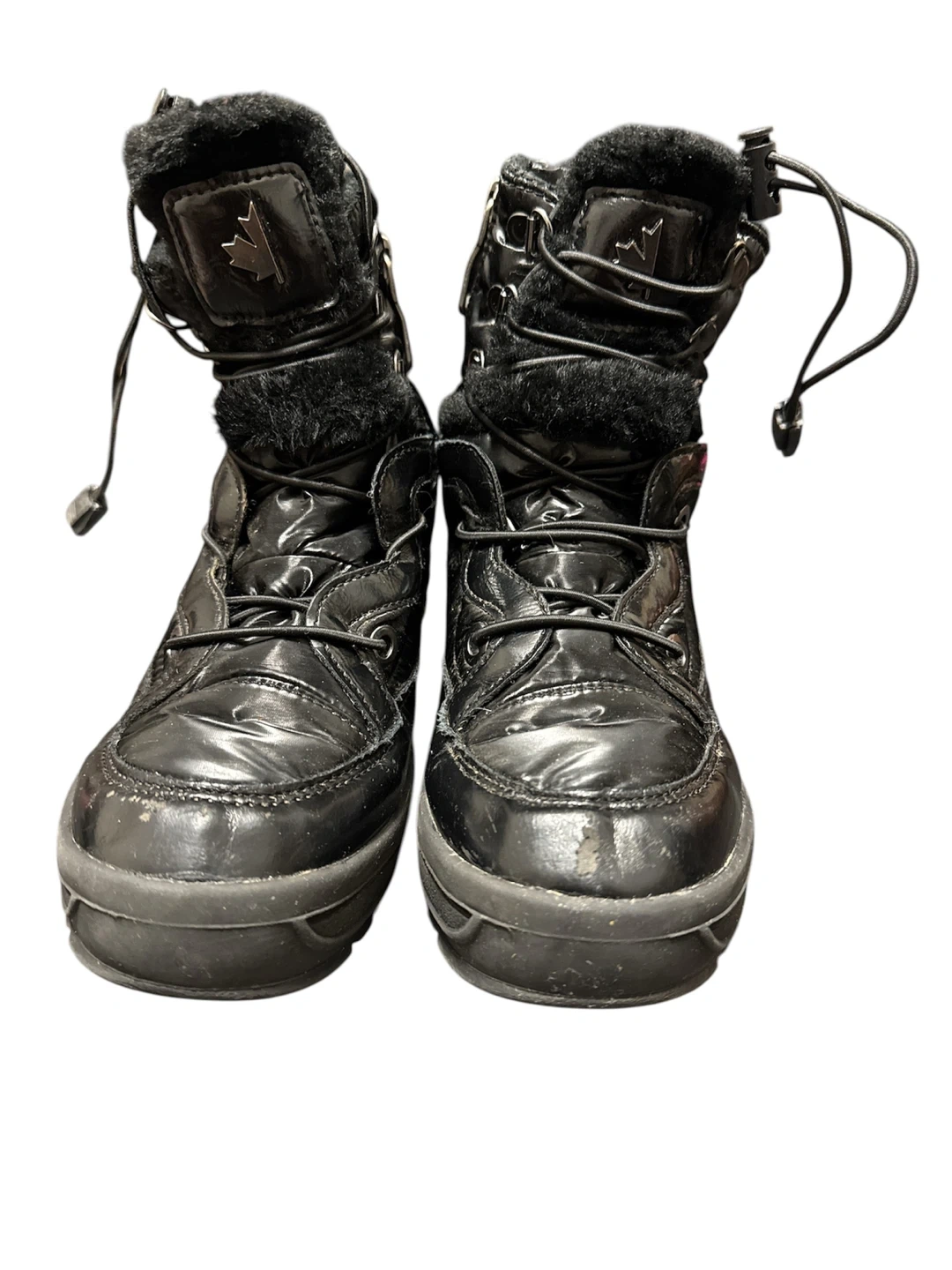 Pajar Canada winter boots for kids. Black colour with fur lining. Lace-up front with side zipper. Water-resistant material. Great for keeping feet warm and dry in the snow! Small tear on fabric under zipper and wear on toes.
