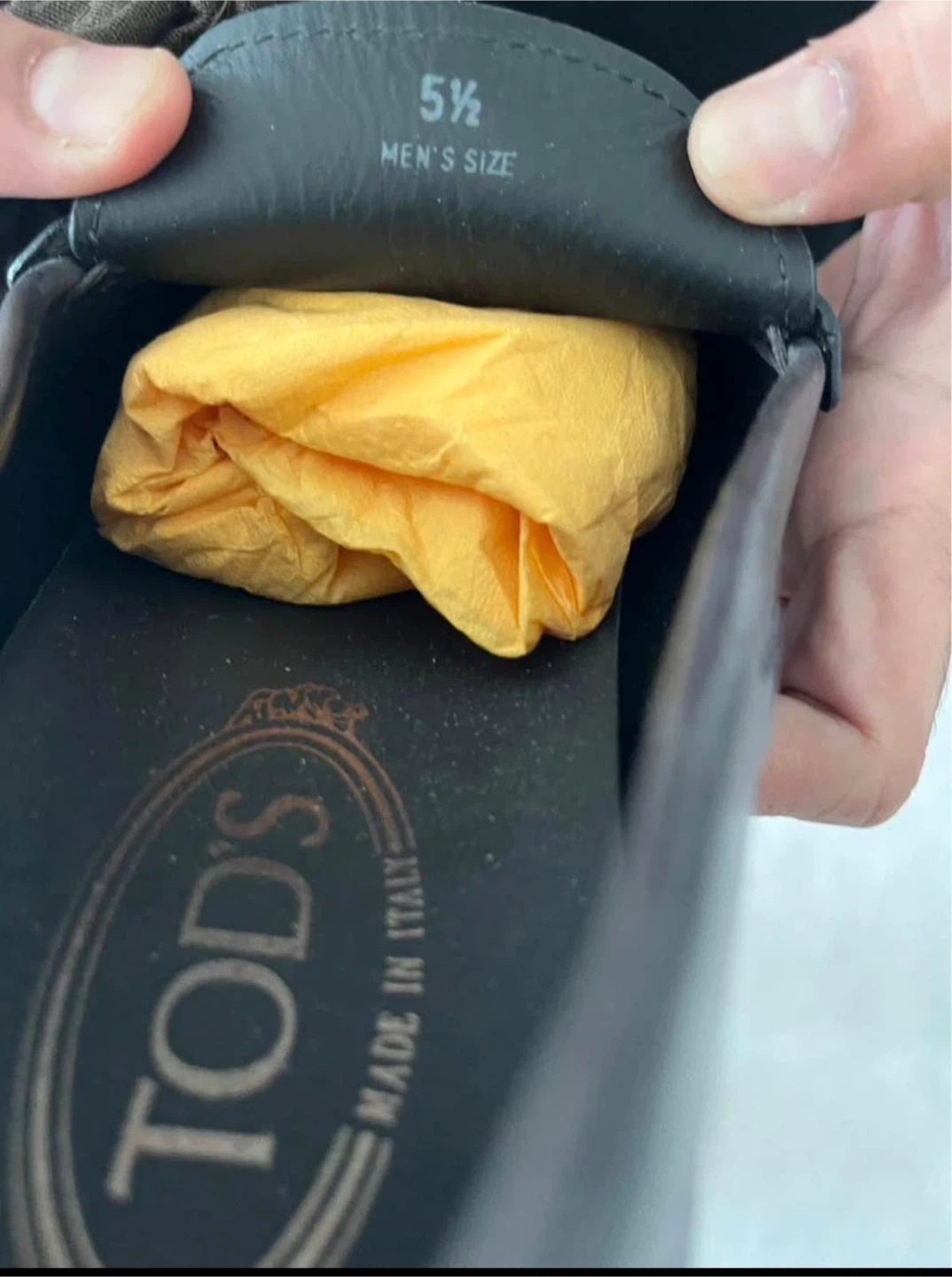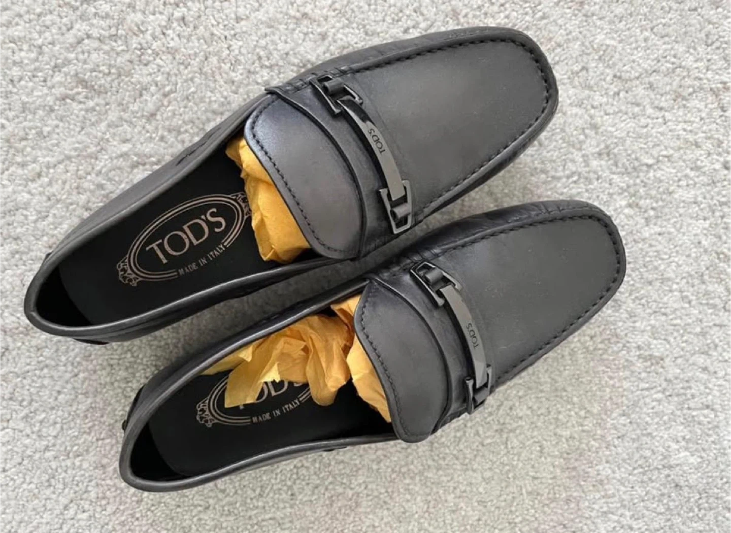 10Selling a pair of Tod's men's loafers in size 5.5. These stylish loafers are made in Italy from black leather and feature a metal accent. They are new.