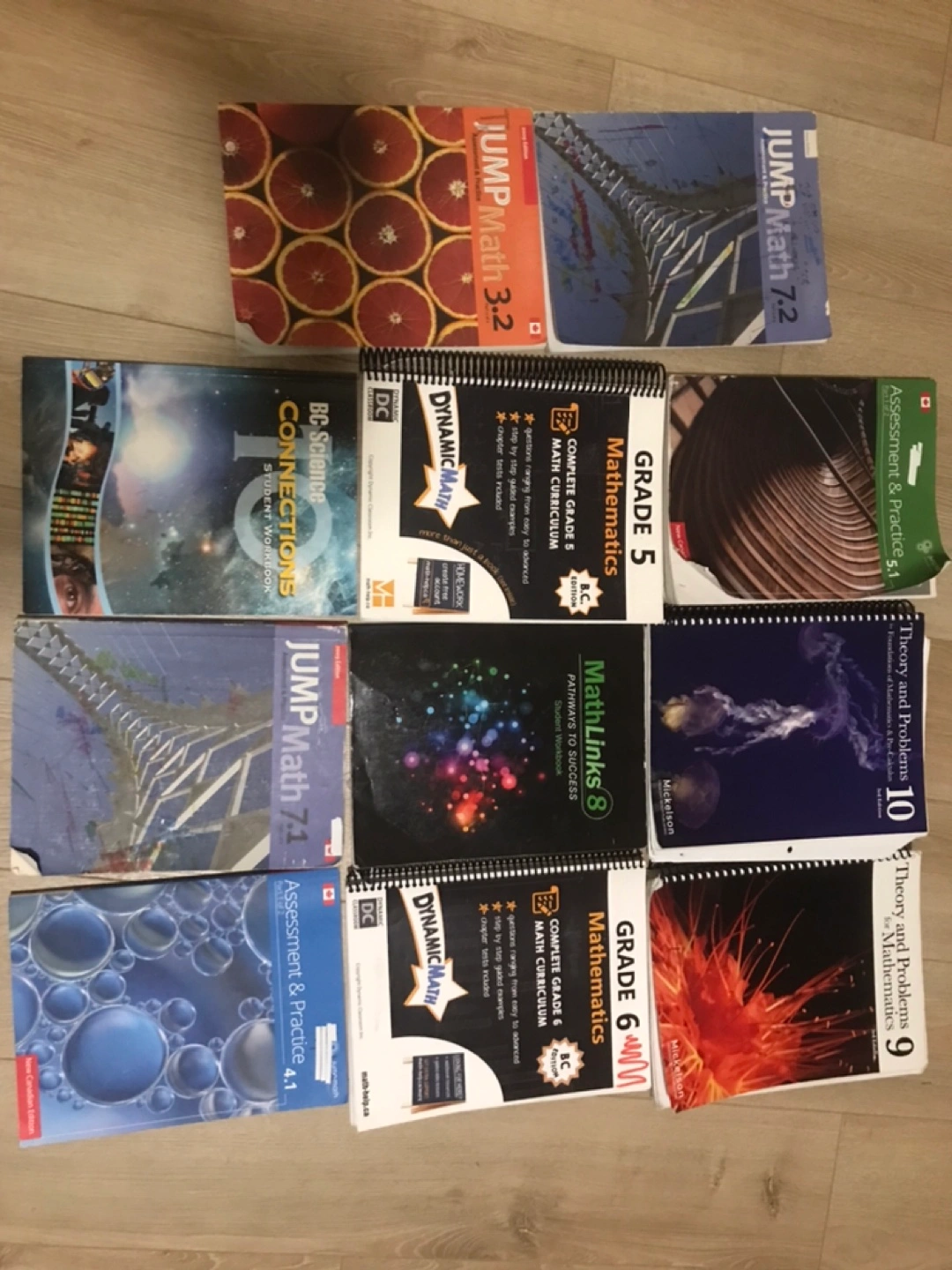 Selling a mixed lot of math and science workbooks. Includes Jump Math (3.2, 7.1, 7.2), Dynamic Math Grade 5 and 6, MathLinks 8, Theory and Problems for Mathematics (9, 10), Assessment & Practice (4.1, 5.1), and BC Science Connections Student Workbook