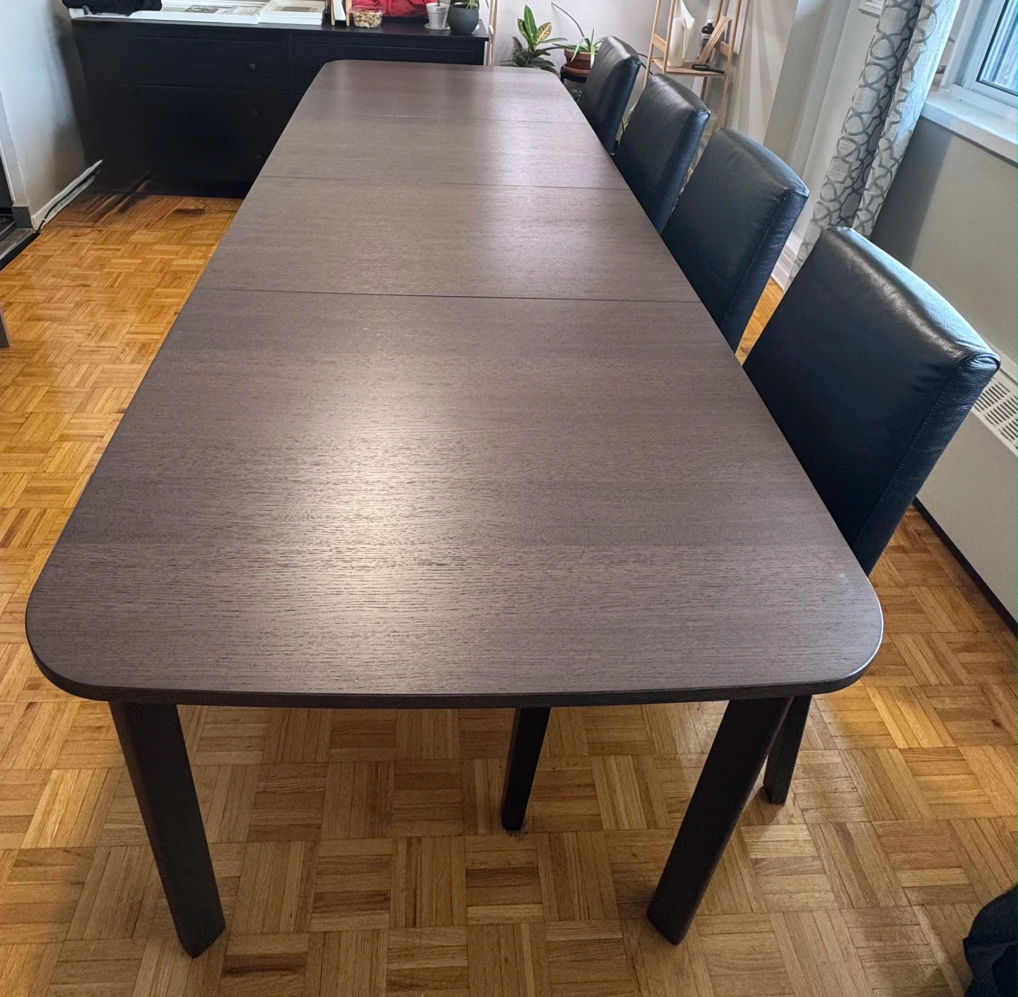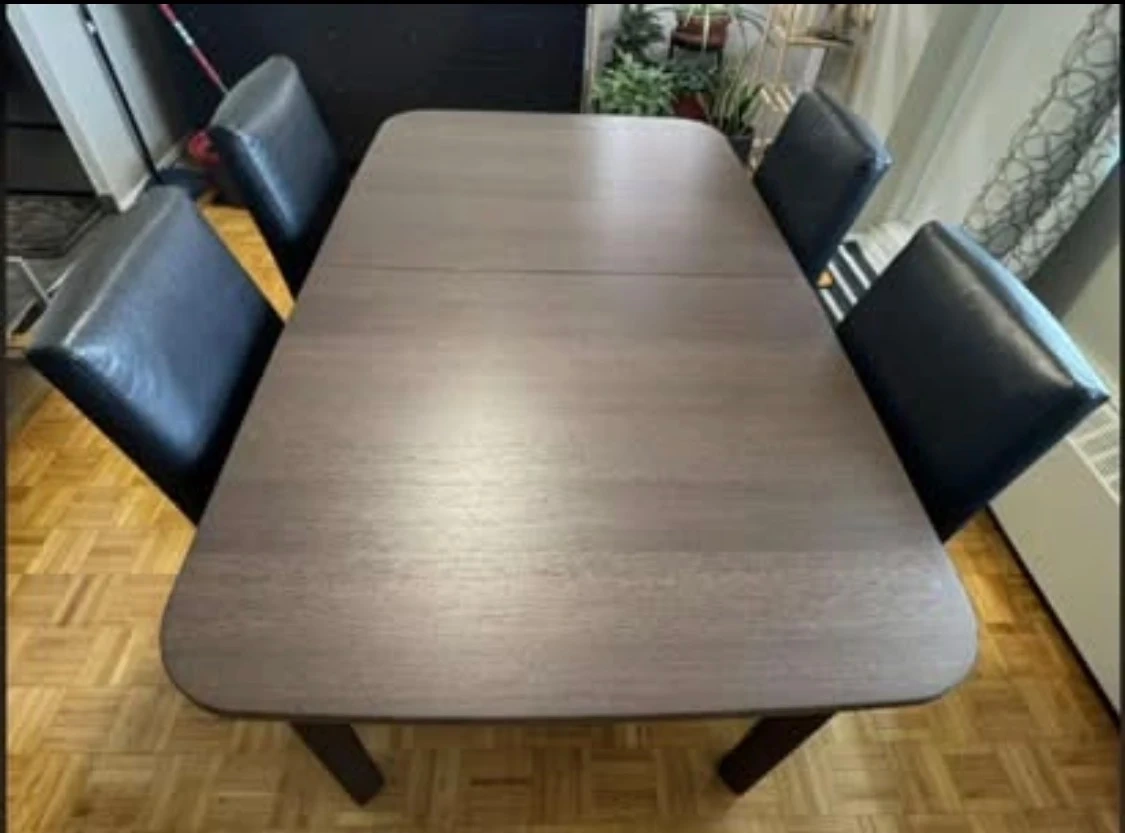 This dining table has a dark brown finish with a wood grain texture. It's extendable, allowing for more seating space. The table's legs are dark and sturdy. It seats up to eight people comfortably.