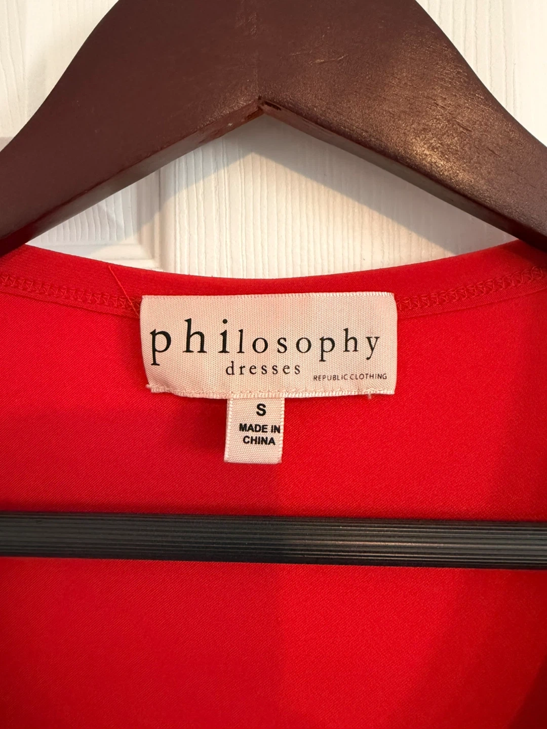 This red dress from Philosophy Dresses features a flattering ruched detail on the side. It's a size small with 3/4 sleeves and a midi length. The fabric is soft and drapes nicely.