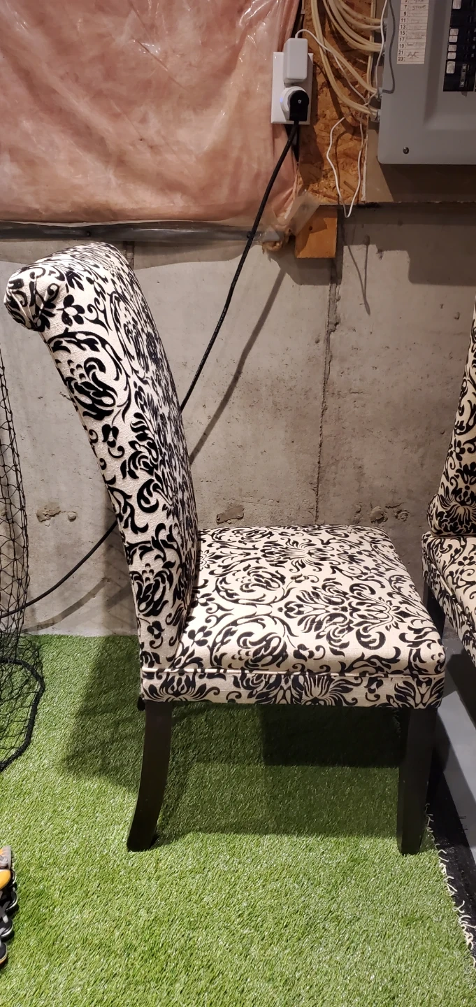 6 Stoney Creek Furniture upholstered dining chairs featuring a black and cream damask print. The chairs have dark wood legs and a high back design. They're perfect for adding a touch of elegance to your dining space.