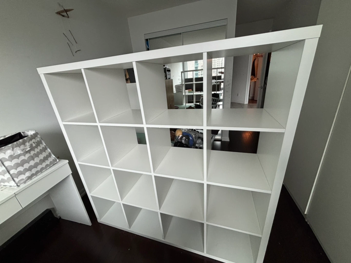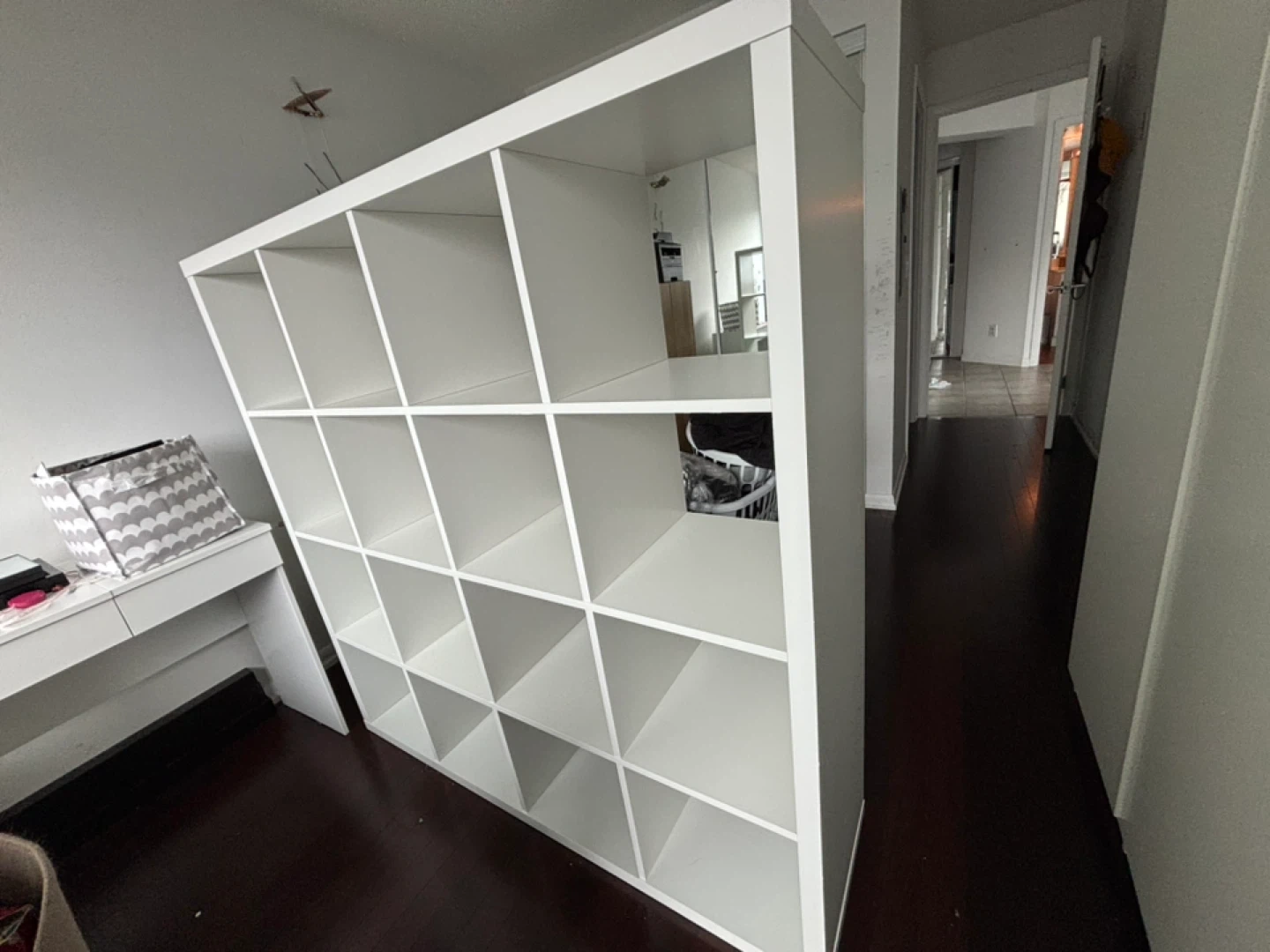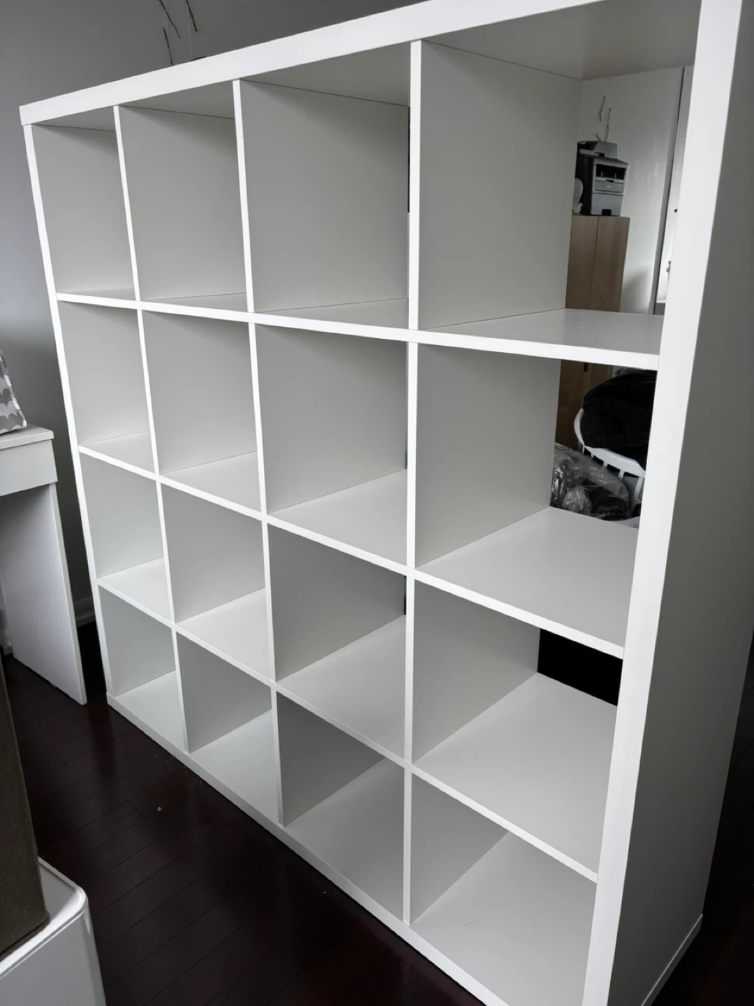 White 4x4 cube storage unit. Perfect for organizing books, decor, or toys. It's a great way to keep your living space tidy!