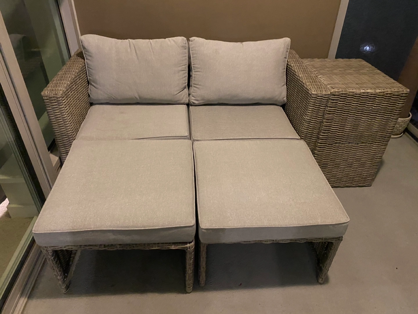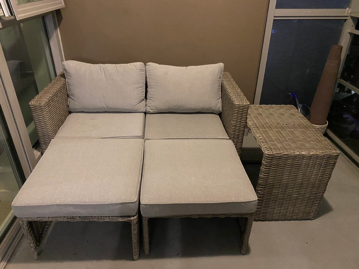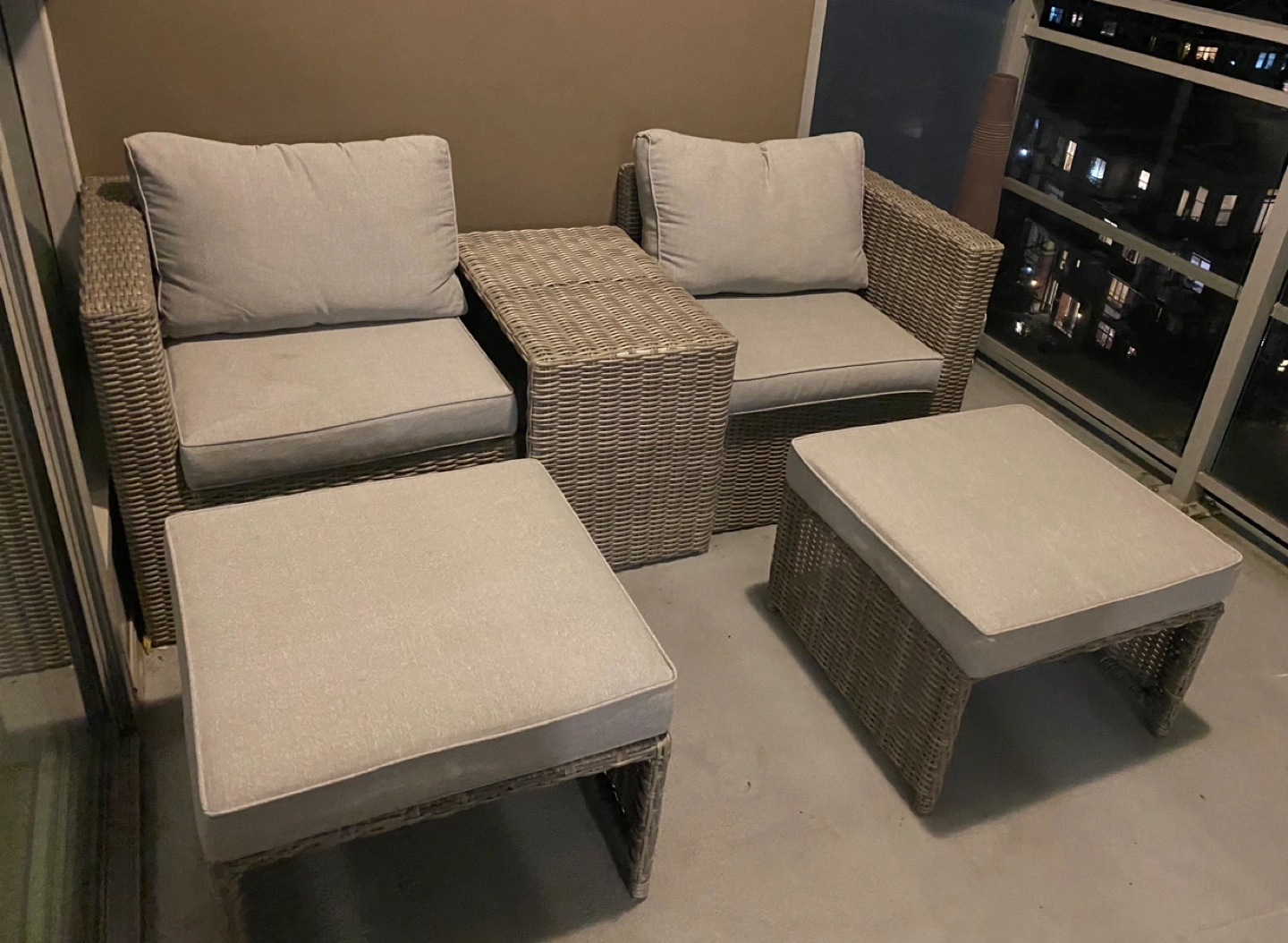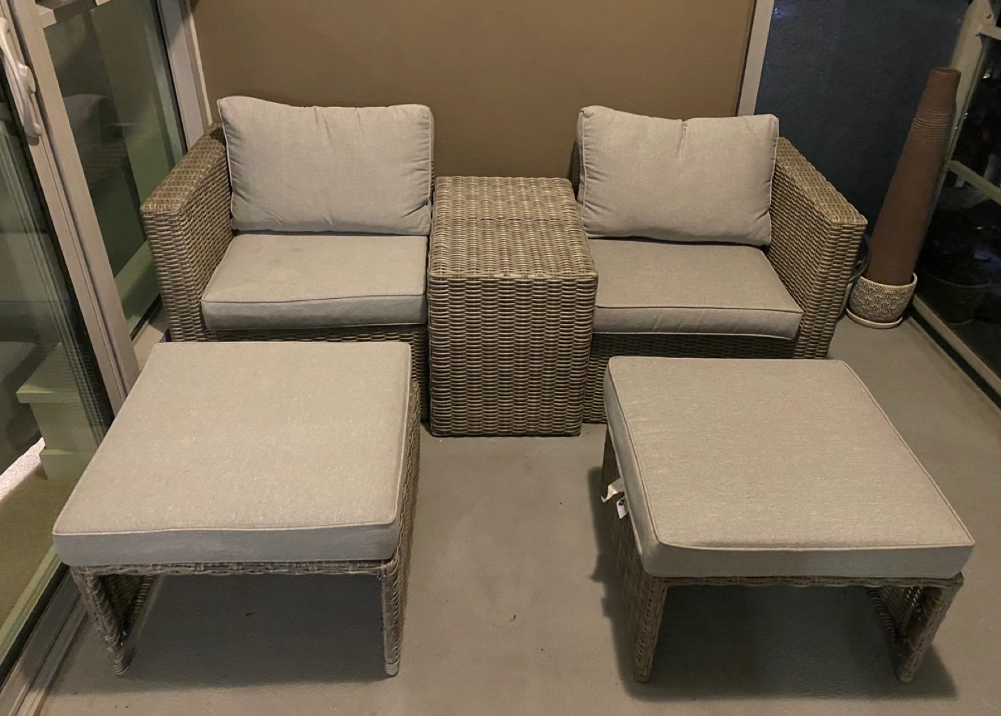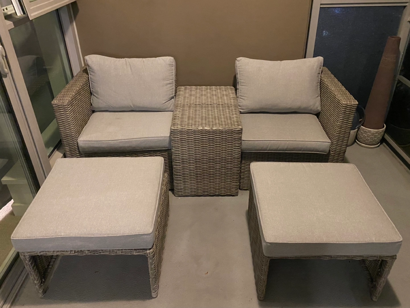 Outdoor wicker patio set with two chairs, two ottomans, and a small table. Grey cushions. All pieces are in fantastic condition. One cushion has a slight dirt stain (have not tried cleaning and am positive it will come off) only used for 1 summer!