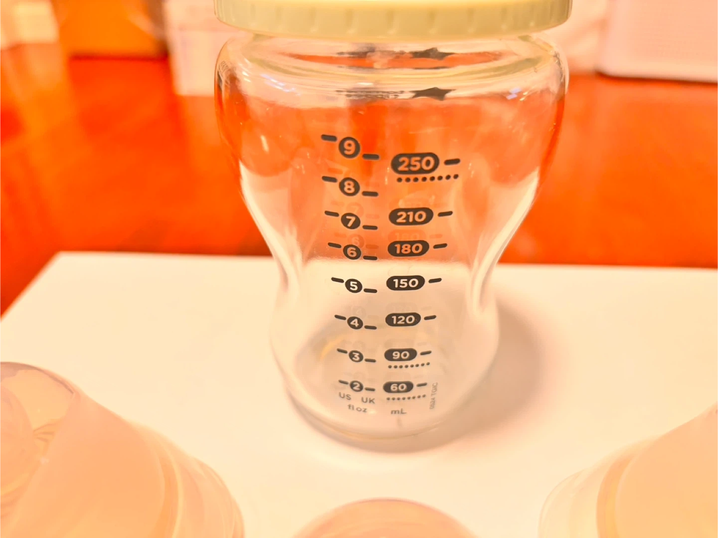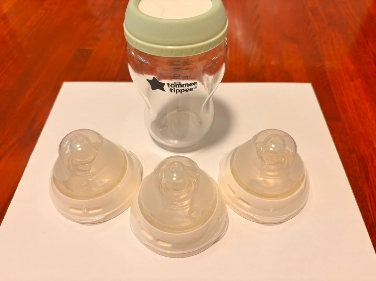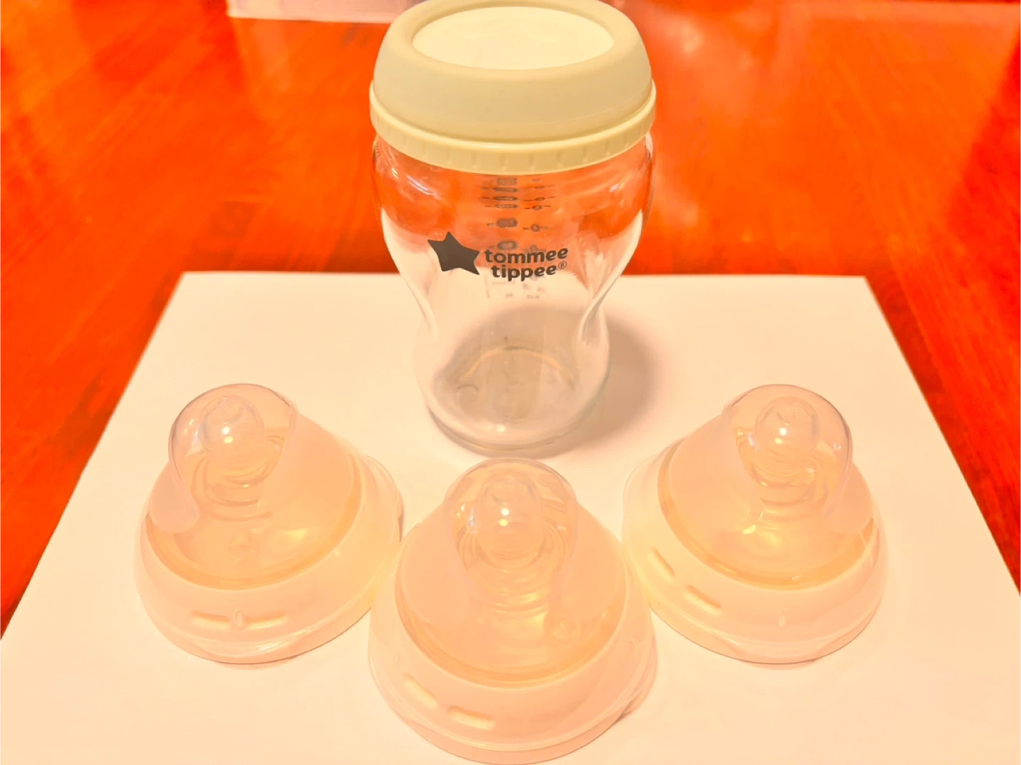 This is a Tommee Tippee glass baby bottle. It comes with three extra nipples. The bottle has clear measurement markings up to 250ml. It's made of glass and safe for little ones.