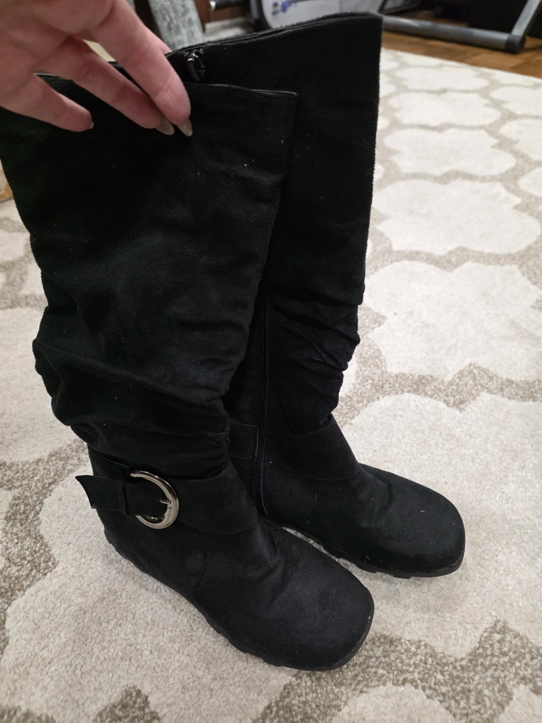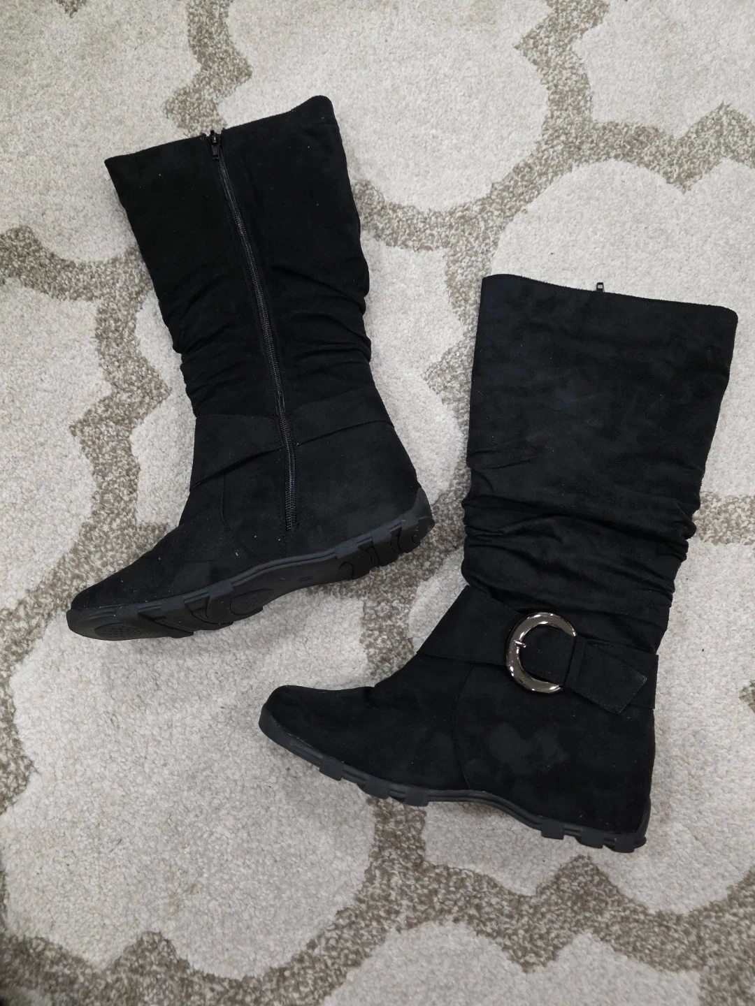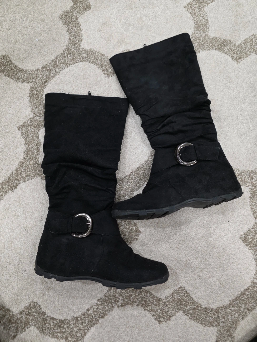Selling a pair of black boots in women's size 7. They have a stylish, slouchy design and a decorative buckle detail. Perfect for adding a bit of edge to your outfit