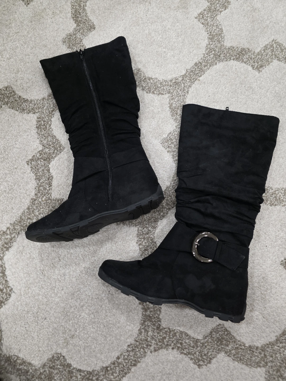 Selling a pair of black boots in women's size 7. They have a stylish, slouchy design and a decorative buckle detail. Perfect for adding a bit of edge to your outfit