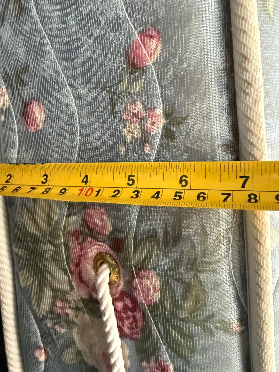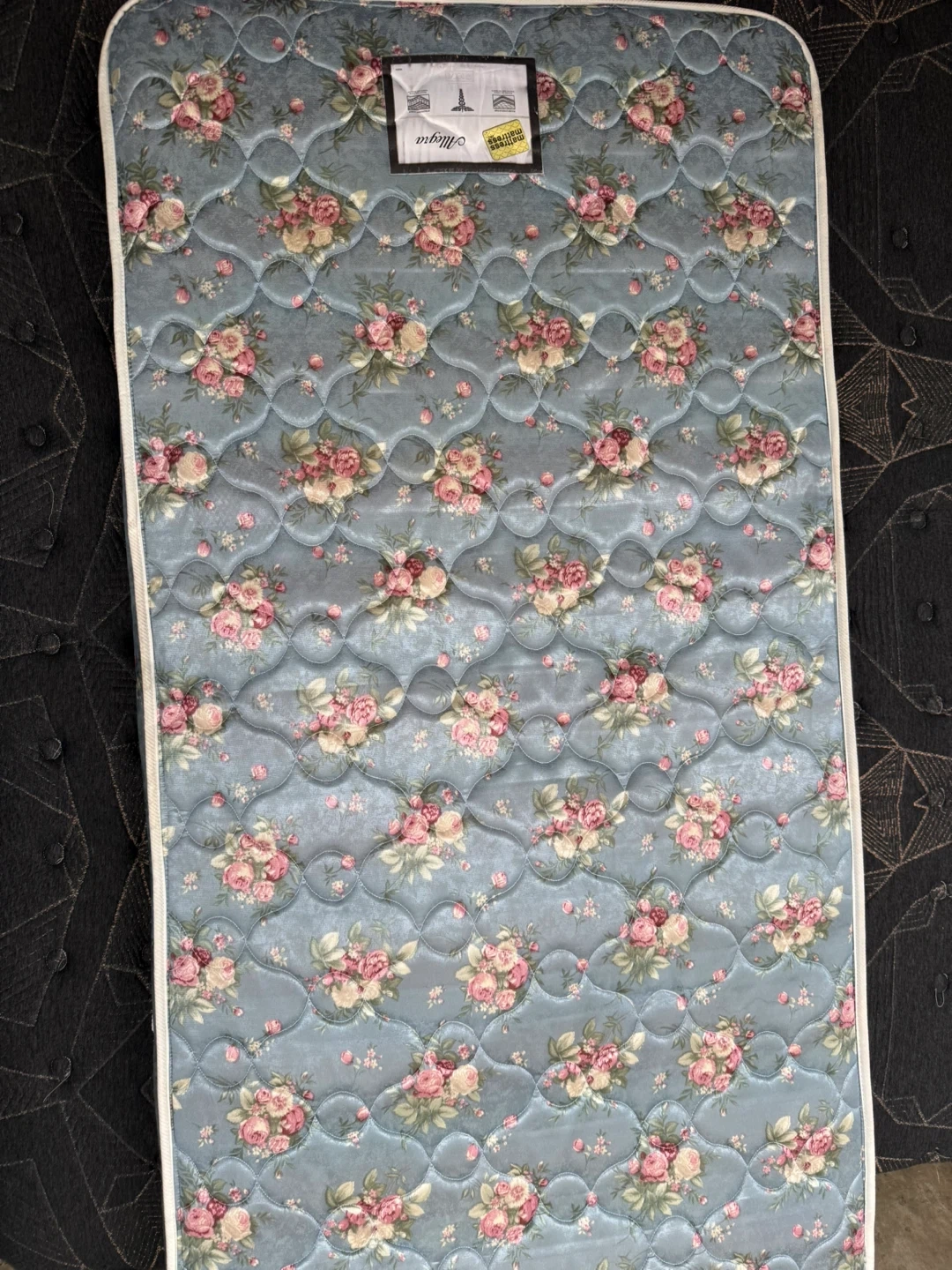 This is a mattress featuring a blue floral pattern with pink roses. It has a quilted surface and a rope trim. It is a twin-size mattress bc spring available for extra cost pickup or delivery available for extra $$